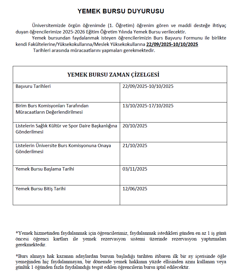 Yemek Bursu Başlama Tarihi 03/11/2025