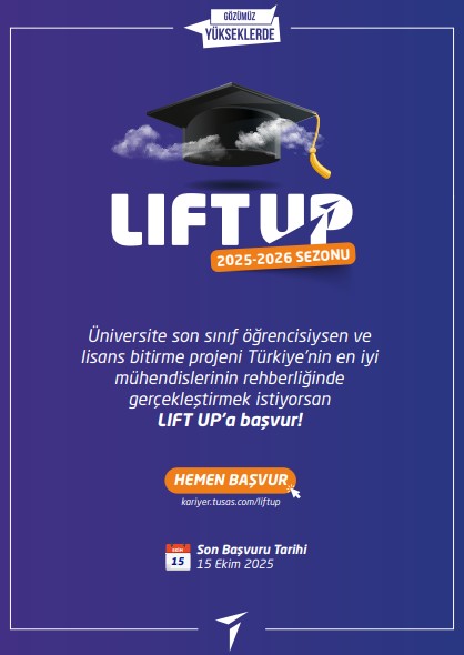 LIFT UP Sanayi Odaklı Lisans Bitirme Projeleri Programı, TUSAŞ'ın faaliyet alanları kapsamında, üniversitelerin lisans son sınıfında öğrenim gören öğrencilerin sanayi odaklı lisans bitirme projelerini TUSAŞ bünyesinde gerçekleştirmelerini sağlamaktadır. 2025-2026 dönemi LIFT UP Programı başvuruları, 15 Ekim 2025 tarihine kadar https://liftup.tusas.com adresinden kabul edilecektir. Başvuru kriterleri ve 271 adet havacılık konusuna dair ayrıntılı bilgilere https://kariyer.tusas.com/liftup adresinden erişilebilir ve aynı sistem üzerinden başvurular gerçekleştirilebilir.
