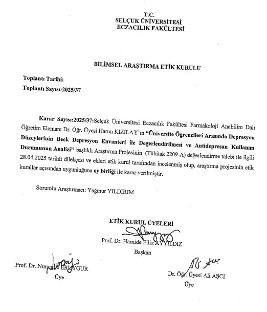 Üniversitemiz Eczacılık Fakültesi, Meslek Bilimleri Bölümü, Farmakoloji Anabilim Dalı öğretim elemanı Dr. Öğr. Üyesi Harun KIZILAY'ın danışmanlığını ve Fakülte öğrencisi Yağmur Yıldırım'ın yürütücülüğünü yaptığı, TÜBİTAK 2209-A Üniversite Öğrencileri Araştırma Projeleri Desteği Programı kapsamında sunulan; "Üniversite Öğrencileri Arasında Depresyon Düzeylerinin Beck Depresyon Envanteri ile Değerlendirilmesi ve Antidepresan Kullanım Durumunun Analizi" başlıklı proje ile ilgili anket çalışmasının Üniversiteniz bünyesinde yapılması ve duyurulması hususunda;