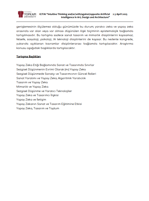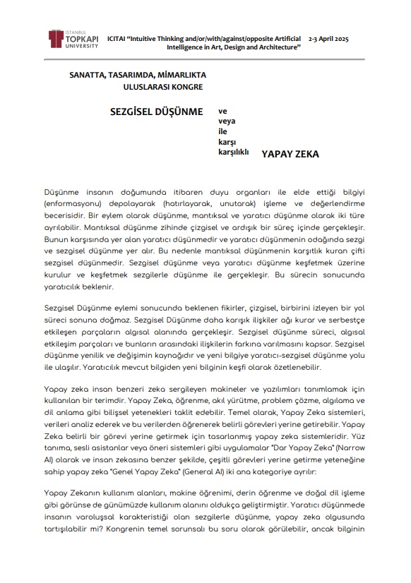“Sanatta, Tasarımda, Mimarlıkta Sezgisel Düşünme Ve/veya/ile/karşı/karşılıklı Yapay Zeka” Kongre Daveti