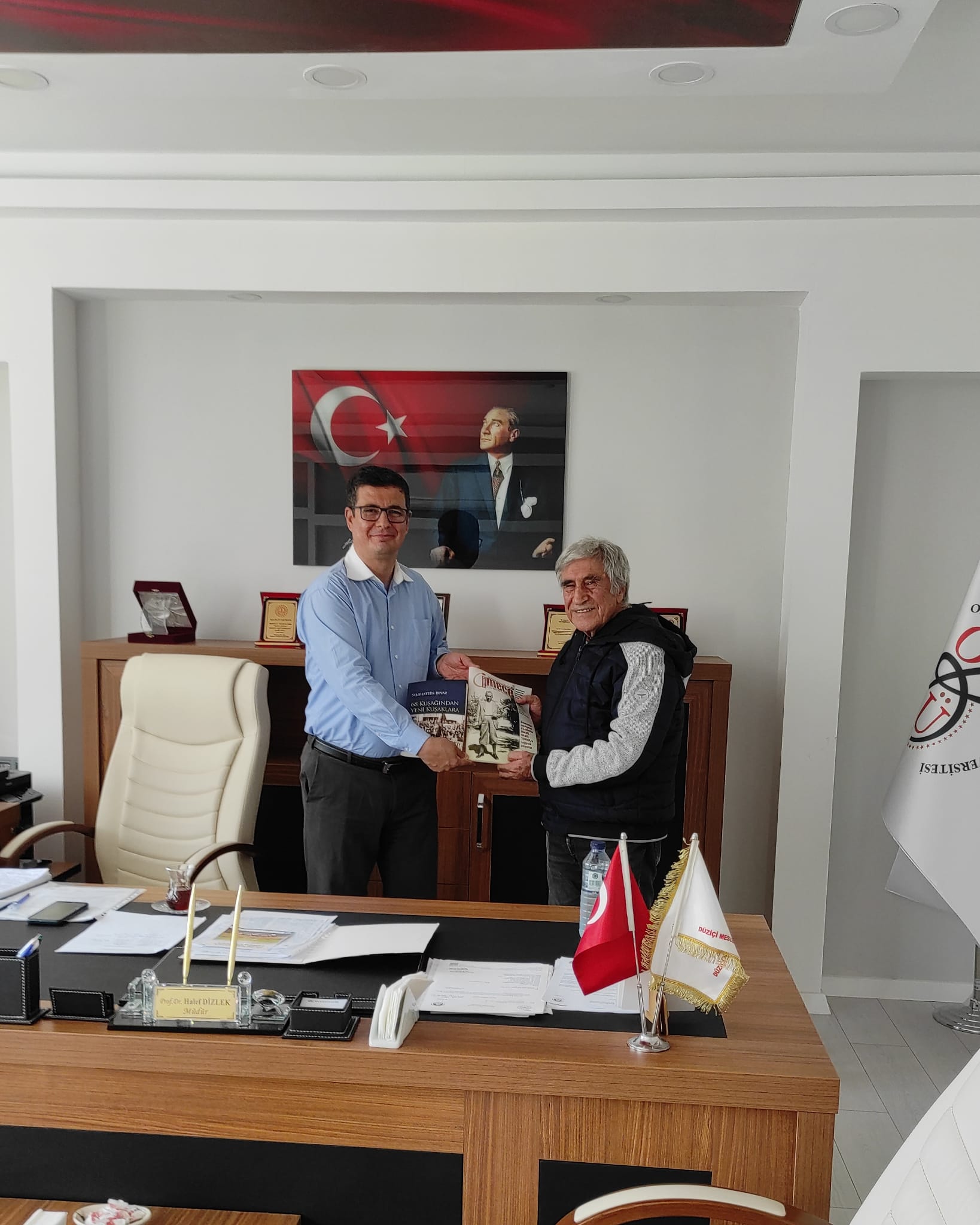 Meslek Yüksekokulumuzda 2000-2014 yıları arasında görev yapan emekli Öğretim Görevlisi Dr. Selahattin BEYAZ, Meslek Yüksekokulumuz Müdürü Prof. Dr. Halef DİZLEK’i 21.10.2025 tarihinde makamında ziyaret etti ve başarı dileklerinde bulundu. Ziyaretinde hazırlamış olduğu bir kitabı ve yazarı olduğu dergiyi müdürümüze takdim eden Selahattin BEYAZ hocamıza, MYO'muza yapmış olduğu hizmetlerden dolayı teşekkür ederiz.