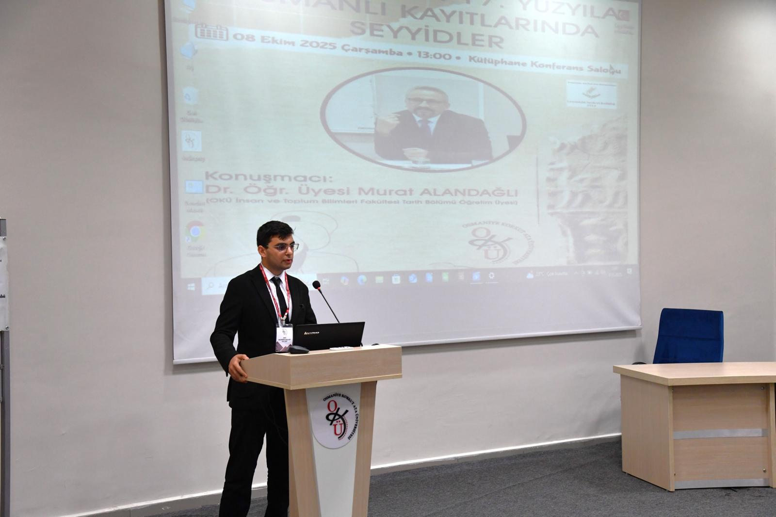 Kütüphane Amfisi’nde gerçekleştirilen etkinliğin konuşmacısı, İnsan ve Toplum Bilimleri Fakültesi Tarih Bölümü öğretim üyesi Doç. Dr. Murat Alandağlı oldu. Alandağlı, konuşmasında Osmanlı arşiv kayıtları üzerinden seyyidlik kurumunun toplumsal, kültürel ve idarî yönlerini ele alarak dönemin tarihî belgelerinden örnekler paylaştı.