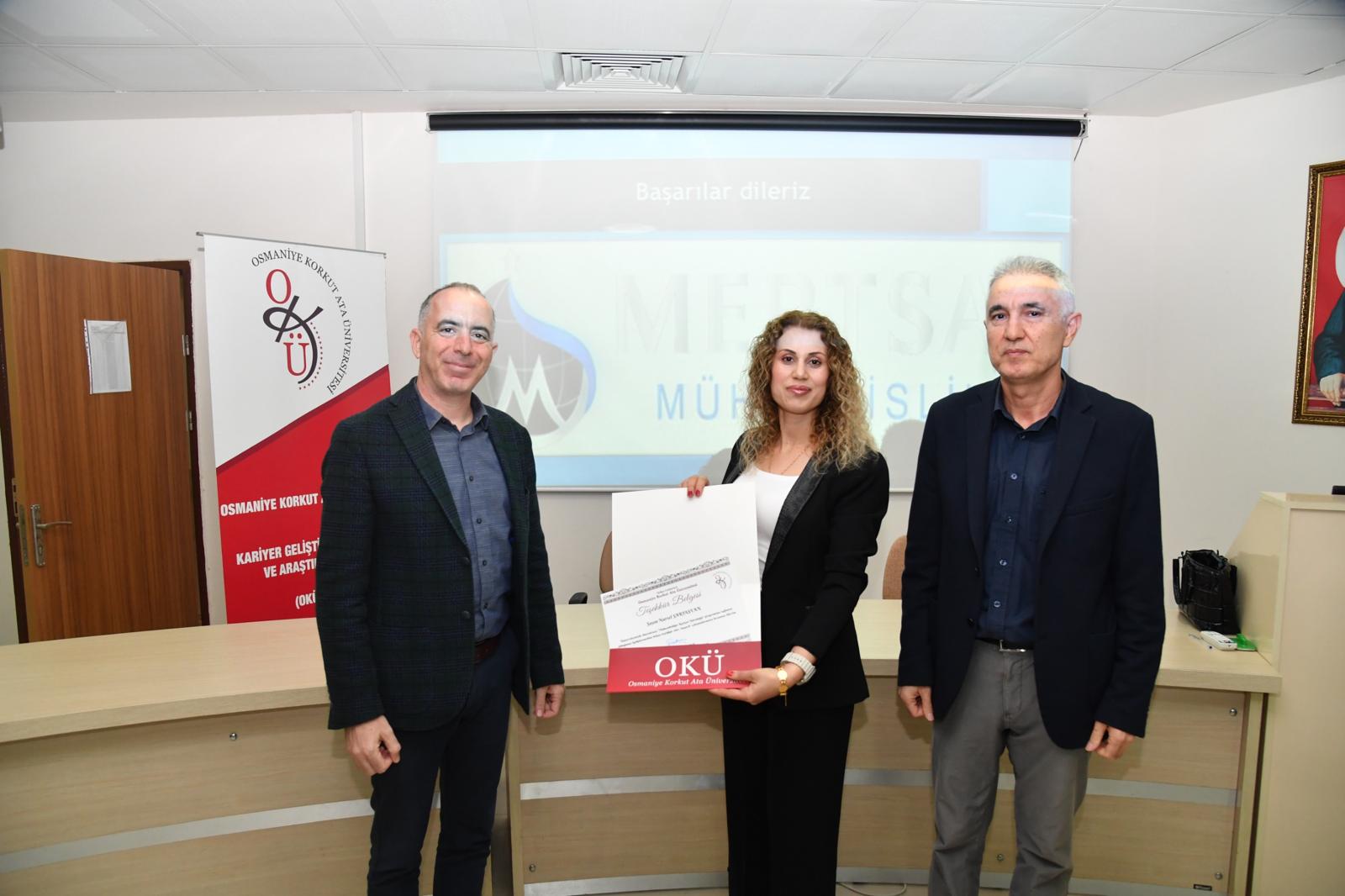 Etkinliğin sonunda, Mühendislik ve Doğa Bilimleri Fakültesi Dekanı Prof. Dr. Ertaç Hürdoğan tarafından, Mertsal Makina Mühendislik Enerji San. ve Tic. Ltd. Şti. İdari Direktörü Nursel Sarıaslan’a teşekkür belgesi takdim edildi.