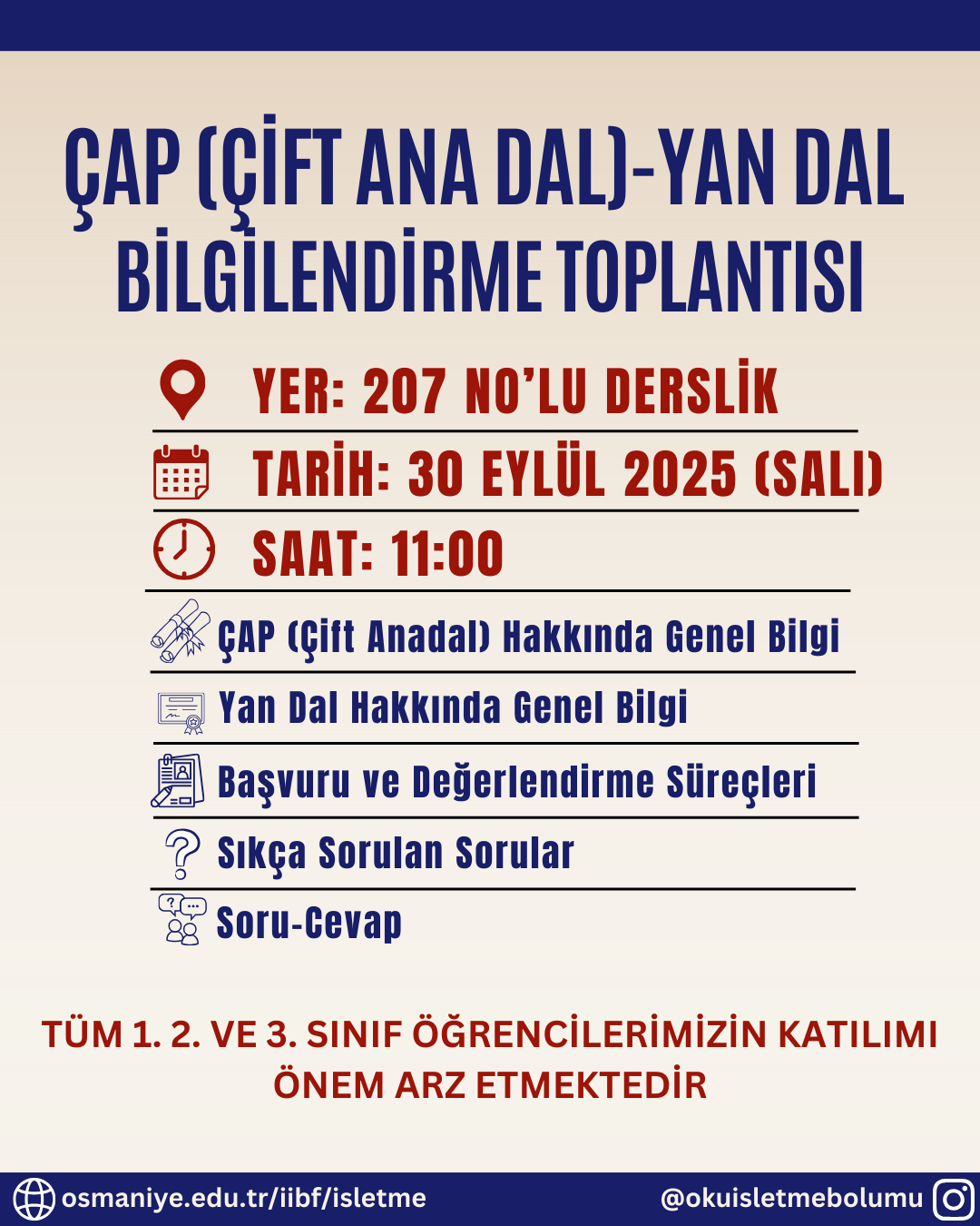 Osmaniye Korkut Ata Üniversitesi İşletme Bölümü tarafından, öğrencilerimizi akademik gelişim ve kariyer planlamaları konusunda bilgilendirmek amacıyla ÇAP (Çift Anadal) ve Yan Dal Bilgilendirme Toplantısı düzenlenecektir.