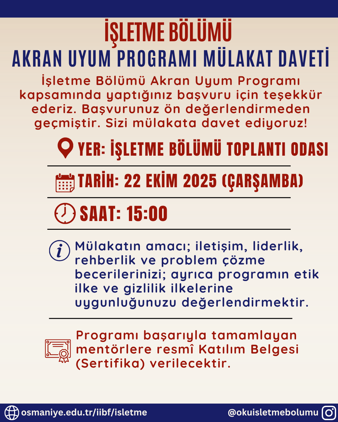 Osmaniye Korkut Ata Üniversitesi İktisadi ve İdari Bilimler Fakültesi İşletme Bölümü tarafından yürütülen Akran Uyum Programı kapsamında yapılan başvuruların ön değerlendirme süreci tamamlanmıştır. Ön değerlendirmeyi geçen öğrenciler, aşağıda bilgileri yer alan mülakata davet edilmiştir.