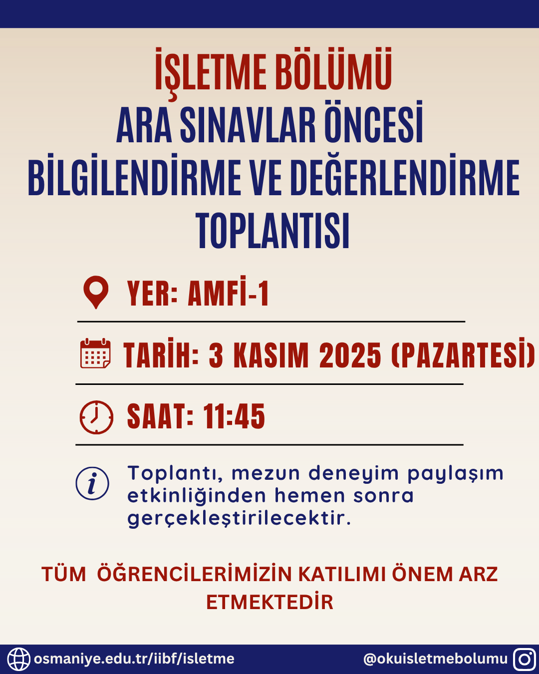 İşletme Bölümü tarafından, 2025–2026 Akademik Yılı Güz Dönemi ara sınavları öncesinde öğrencilerimizin sınav sürecine ilişkin bilgilendirilmesi ve genel değerlendirmelerin yapılması amacıyla bir toplantı düzenlenecektir.