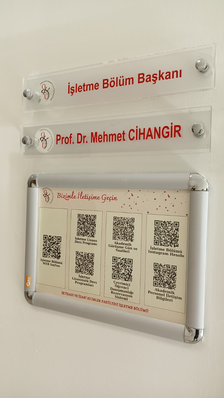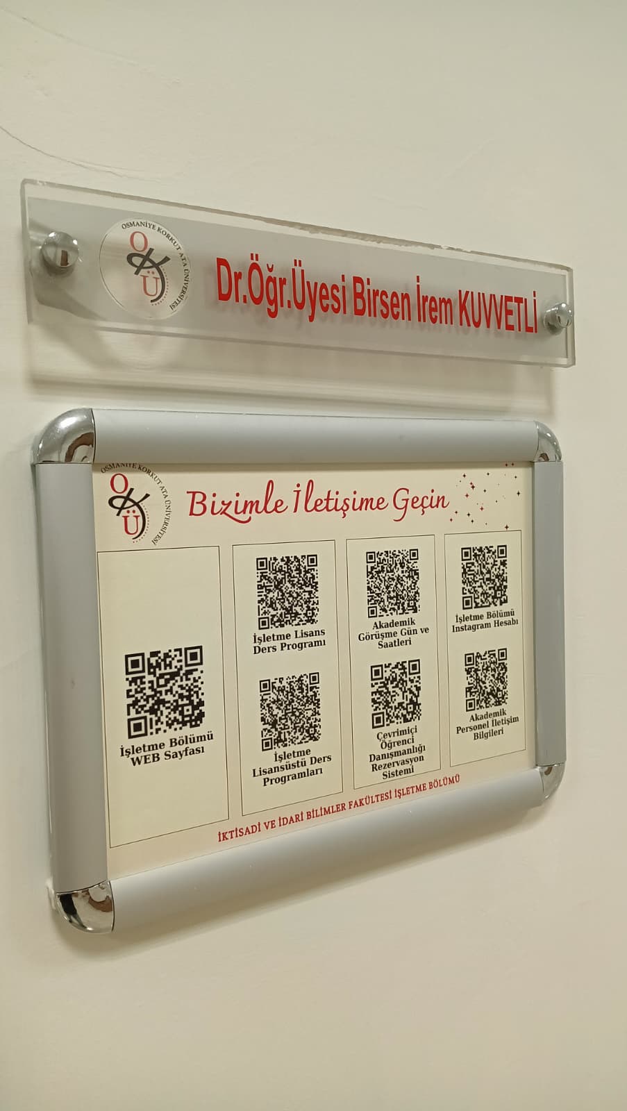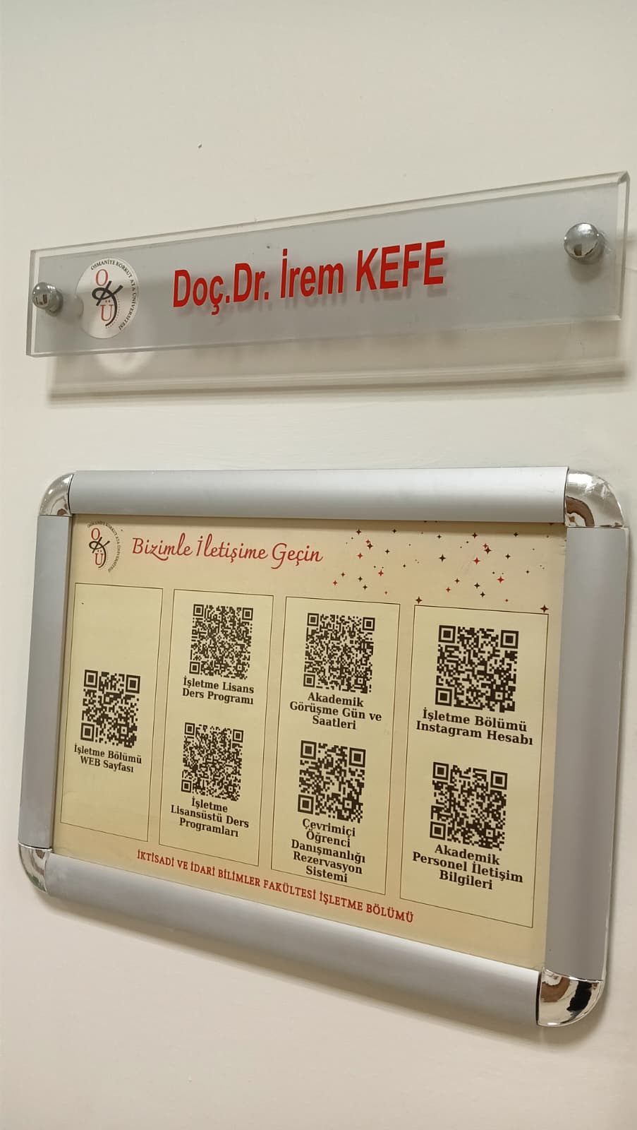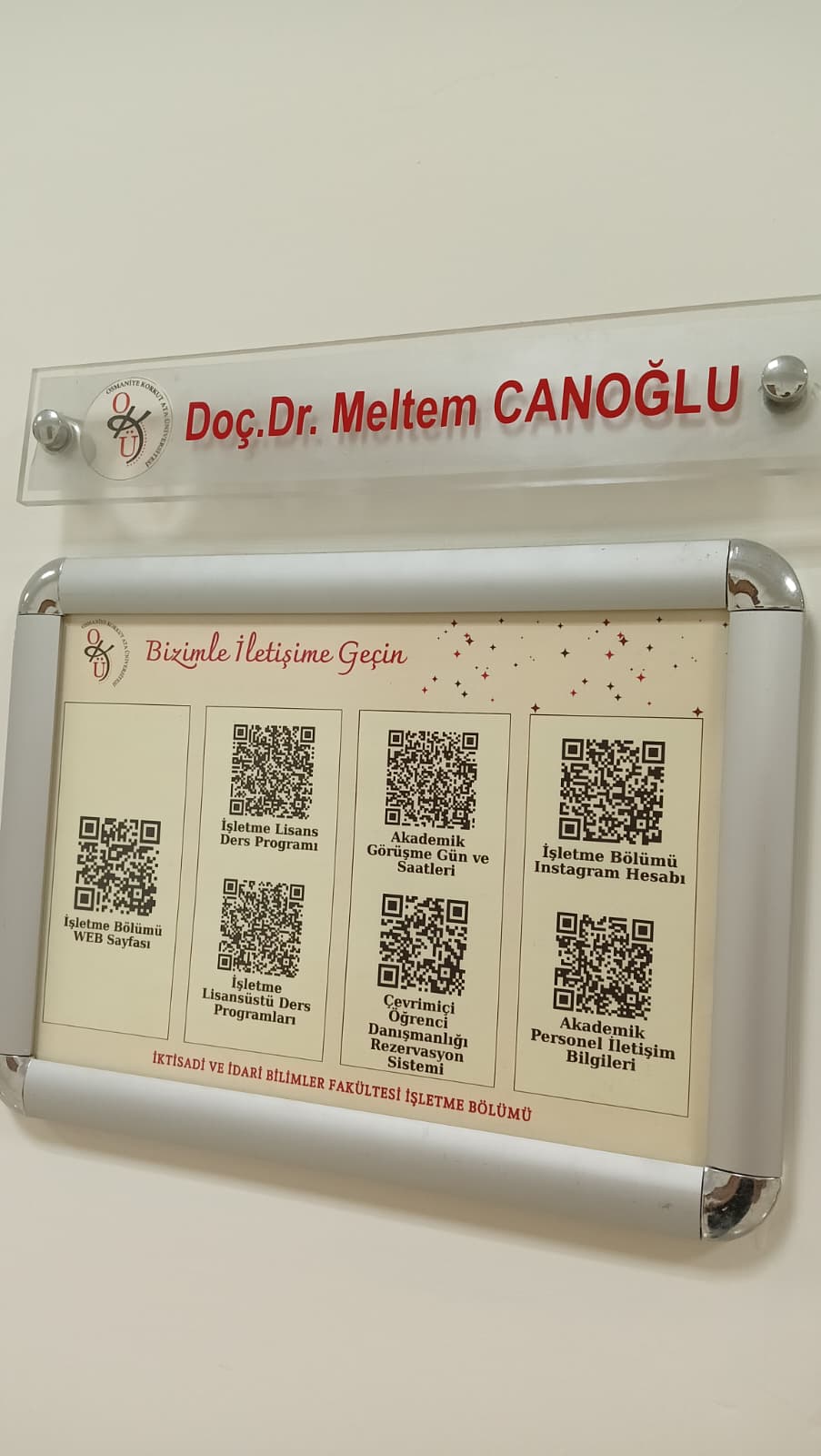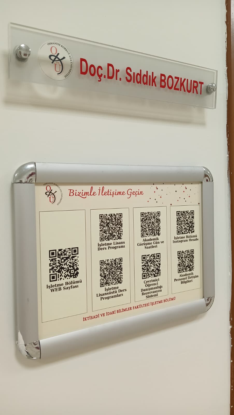 Bölümümüz tarafından hazırlanan “Bizimle İletişime Geçin” başlıklı QR kodlu bilgi panoları, tüm öğretim elemanlarımızın ofislerinde yerini aldı. Bu panolar sayesinde öğrencilerimiz; ders programlarına, akademik danışmanlık gün ve saatlerine, akademik personel iletişim bilgilerine, çevrimiçi danışmanlık rezervasyon sistemine, İşletme Bölümü sosyal medya hesabına ve daha birçok güncel bilgiye, yalnızca QR kodu okutarak anında ulaşabilecek.