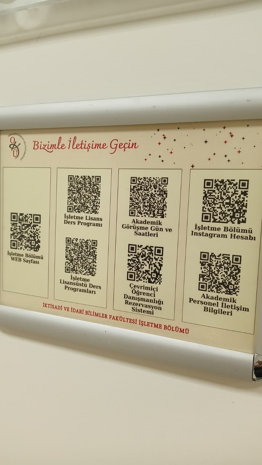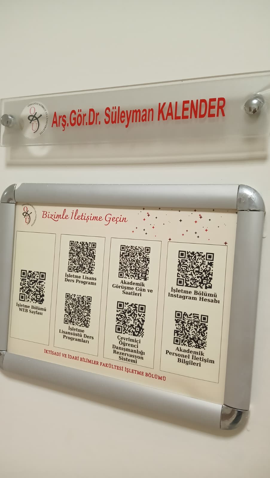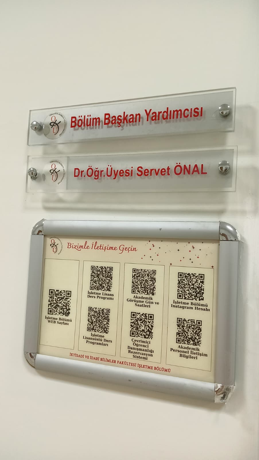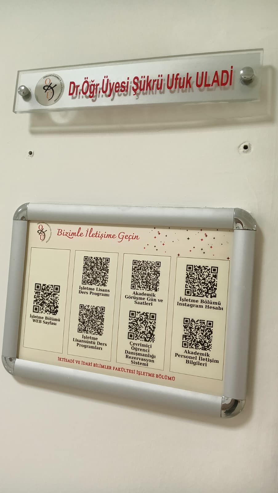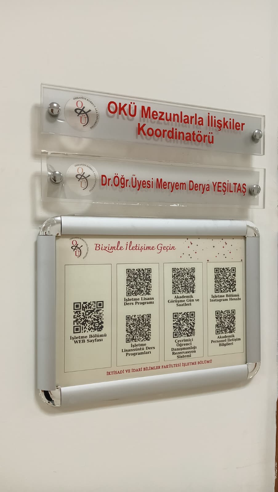 Bölümümüz tarafından hazırlanan “Bizimle İletişime Geçin” başlıklı QR kodlu bilgi panoları, tüm öğretim elemanlarımızın ofislerinde yerini aldı. Bu panolar sayesinde öğrencilerimiz; ders programlarına, akademik danışmanlık gün ve saatlerine, akademik personel iletişim bilgilerine, çevrimiçi danışmanlık rezervasyon sistemine, İşletme Bölümü sosyal medya hesabına ve daha birçok güncel bilgiye, yalnızca QR kodu okutarak anında ulaşabilecek.