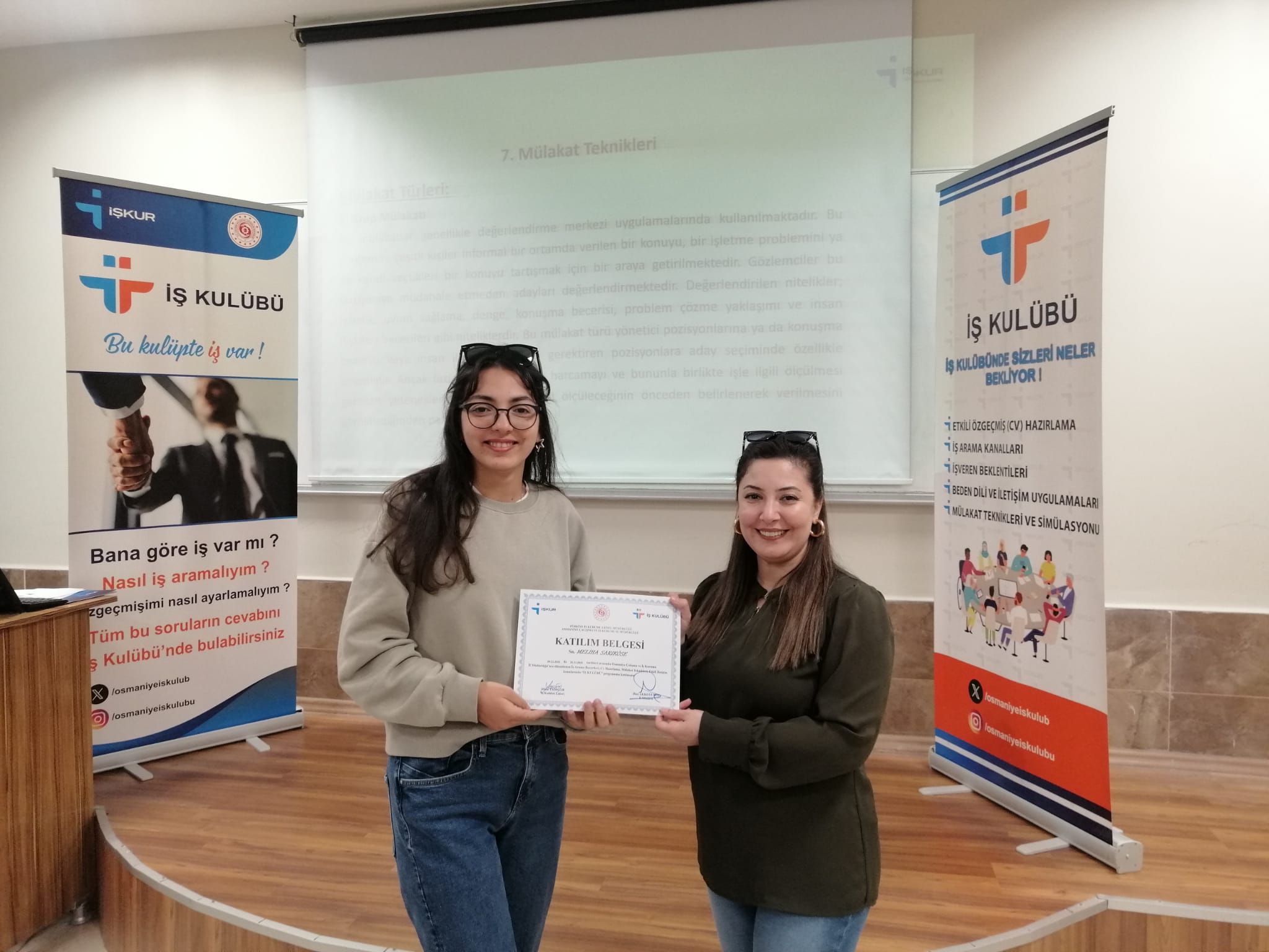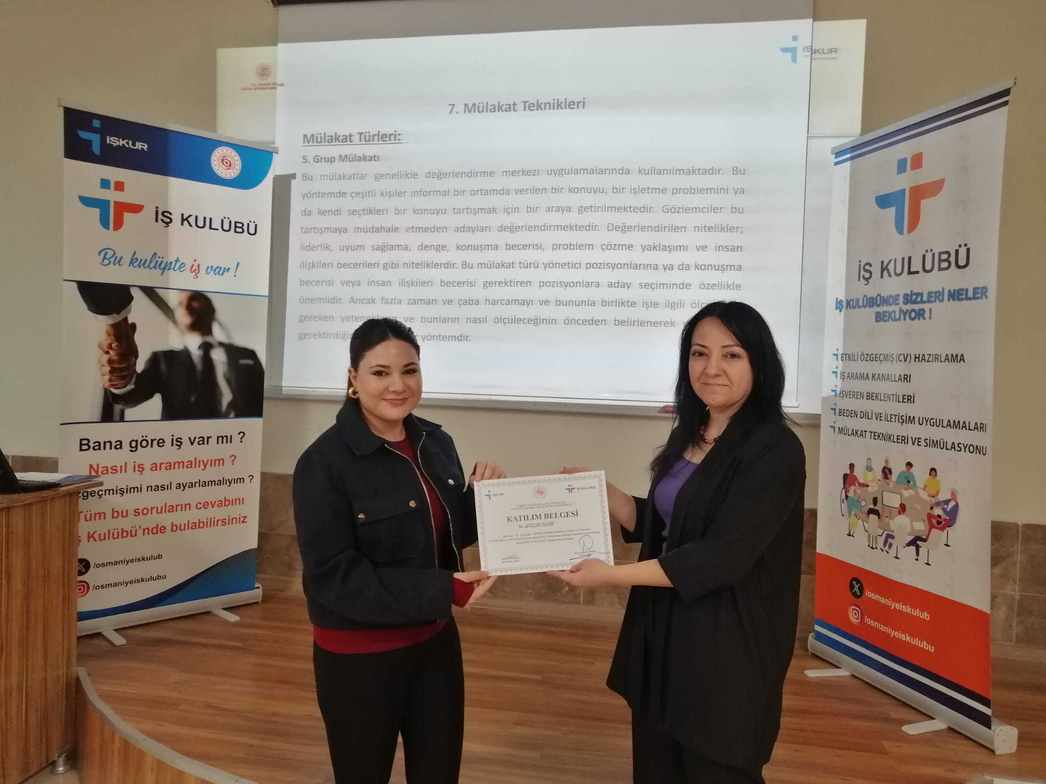 İşletme Bölümü ISL467 Kariyer Yönetimi dersi kapsamında, 24–25 Kasım 2025 tarihlerinde İŞKUR Osmaniye İl Müdürlüğü iş birliğiyle iki günlük İş Kulübü Eğitimi gerçekleştirildi. Öğrencilerin kariyer planlama süreçlerine katkı sunmayı amaçlayan eğitim programı, yoğun ilgi ve yüksek katılımla tamamlandı.