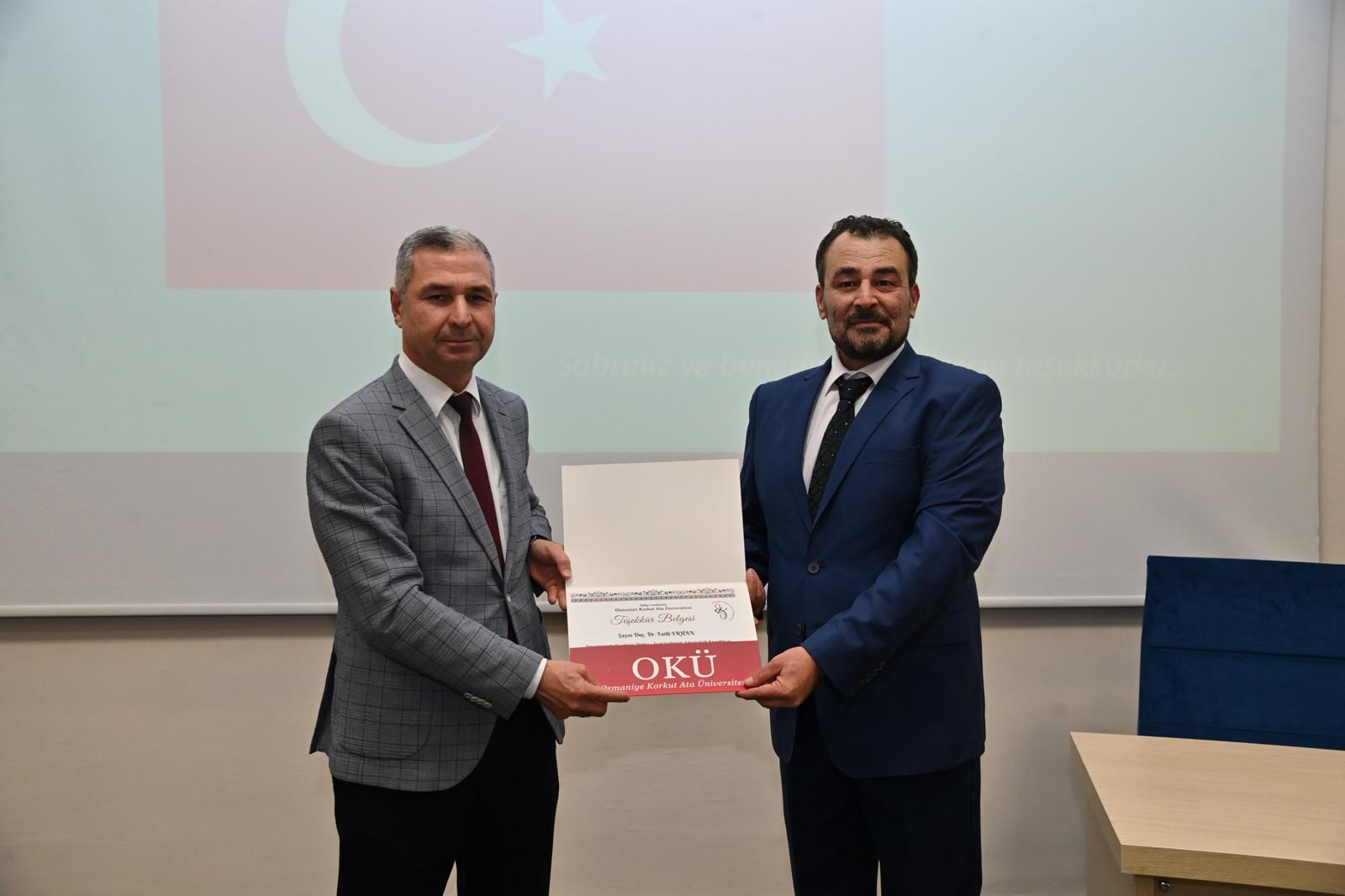 Etkinliğin sonunda, katkılarından dolayı Arkeoloji Bölümü öğretim üyesi Doç. Dr. Fatih Erhan’a teşekkür belgesi, Fakültemiz Dekanı Prof. Dr. Ahmet Demirtaş tarafından takdim edildi.