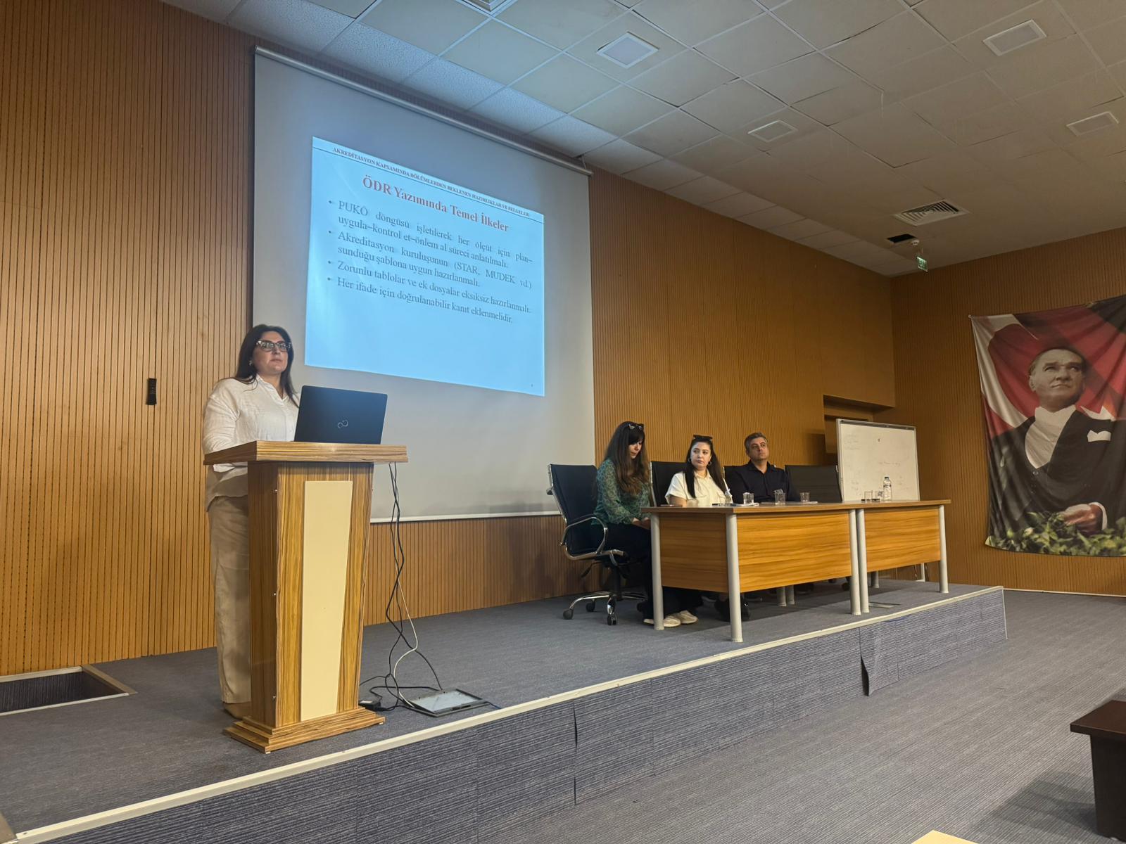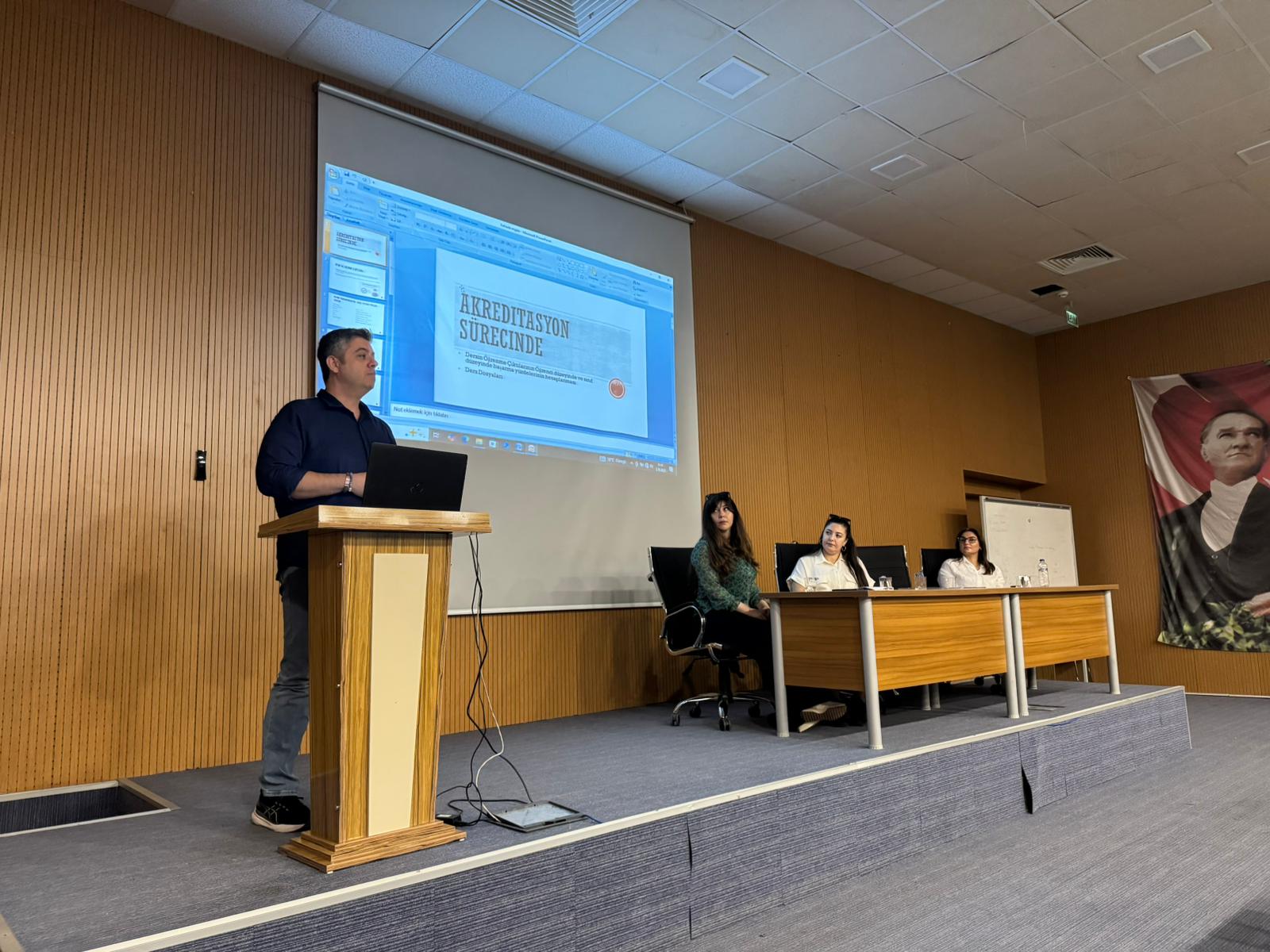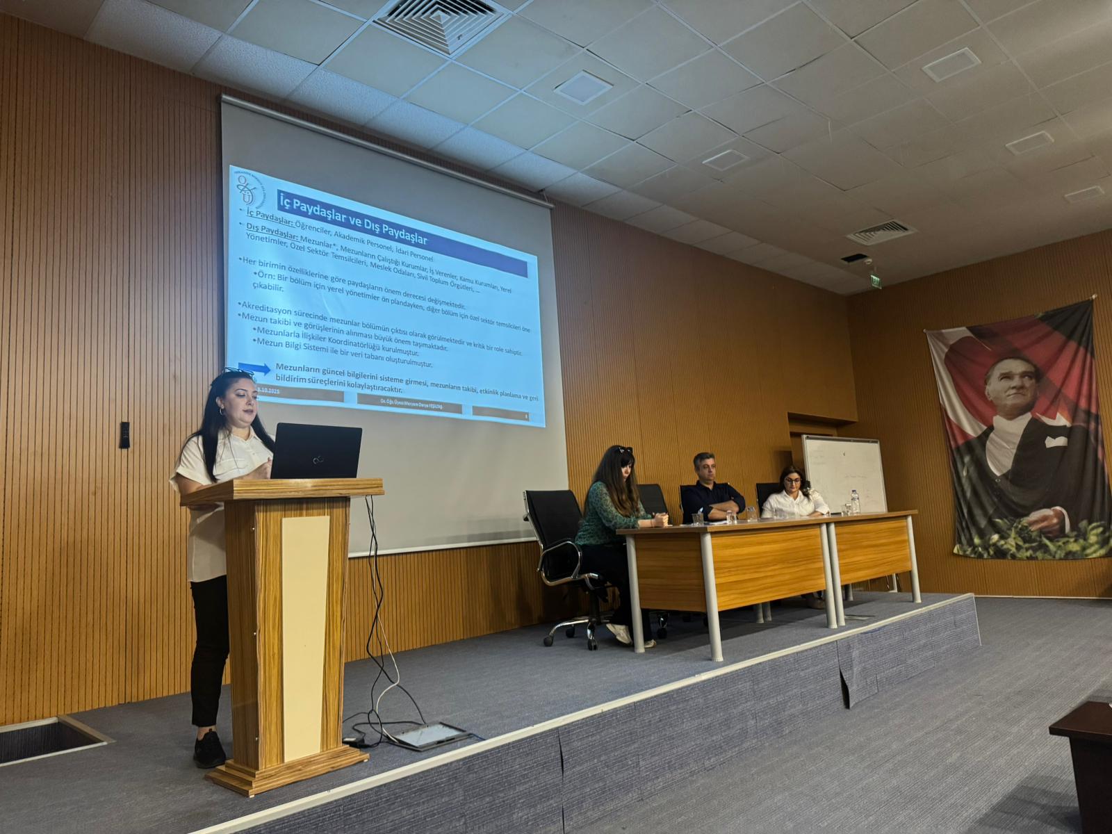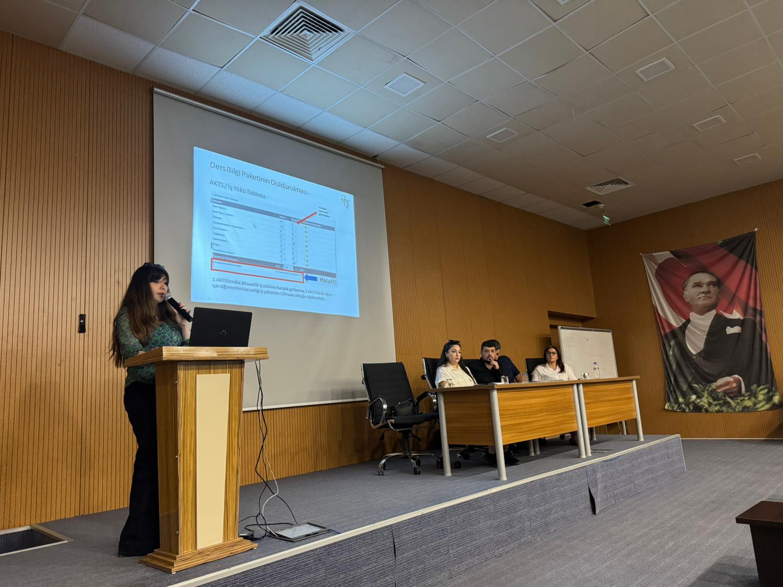 Program kapsamında Dr. Öğr. Üyesi Birsen İrem Kuvvetli, “Bologna Süreci ve Program Yeterlilikleri” başlıklı sunumunda program çıktılarının güncellenmesi ve ilişkilendirilmesi üzerinde durdu. Doç. Dr. Bahadır Ergün, “Ders Öğrenim Çıktıları ve Ders Dosyaları” sunumunda ders tanımları, öğrenim çıktılarının ölçülmesi ve dosya hazırlama süreçlerine ilişkin bilgiler aktardı. Dr. Öğr. Üyesi Meryem Derya Yeşiltaş, “Paydaş Katılımı” sunumunda öğrenci, mezun ve işveren anketleri ile danışma kurulu toplantılarının önemini vurguladı. Doç. Dr. İrem Kefe ise “Bölümlerden Beklenen Hazırlıklar ve Belgeler” başlıklı sunumunda öz değerlendirme raporları, kanıtların hazırlanması ve PUKÖ döngüsü çerçevesinde yürütülmesi gereken çalışmalara dikkat çekti.