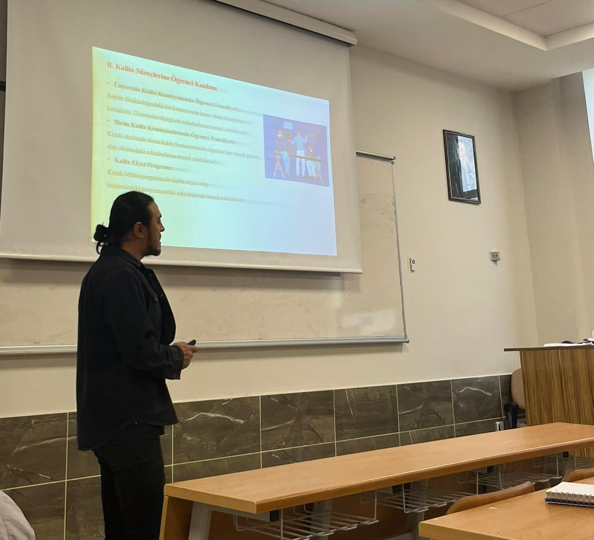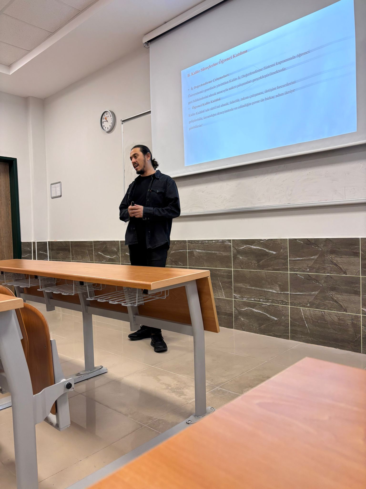Sunum fakültenin akademik kadrosunda yer alan Dr. Öğr. Üyesi Ahmet KARAKOÇ tarafından gerçekleştirildi. Dr. Öğr. Üyesi Ahmet KARAKOÇ, yükseköğretimde kalite güvencesi, akreditasyon sürecinin aşamaları, öğrenci katılımının önemi ve bölümün yürüttüğü kalite iyileştirme çalışmaları hakkında detaylı bilgiler paylaştı. Sunum boyunca öğrencilerin soruları yanıtlanarak, sürece aktif katılımlarının kalite standartlarının yükseltilmesindeki kritik rolüne dikkat çekildi.