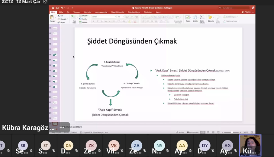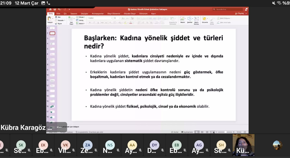 12 Mart 2025 tarihinde Mor Çatı Vakfı Gönüllüsü Kübra KARAGÖZ ile OKÜ Sosyal Hizmet Kulübü ve Kadın Platformu Koordinatörlüğü işbirliğinde Kadın Hakları, Eşitlik ve Güçlenme konulu bir webinar gerçekleştirildi. Program kapsamında Kübra KARAGÖZ, kadına yönelik şiddet türleri, şiddet döngüsü vb. kavramlara ilişkin bilgilendirme yaptı ve kadın hakları mücadelesinin toplumsal cinsiyet eşitliği açısından öneminden bahsetti. Programın yönlendiriciliğini gerçekleştiren OKÜ Kadın Platformu Koordinatörü Doç. Dr. Zeynep TEKİN BABUÇ Mor Çatı Vakfı’nın kadın hakları ve kadının güçlenmesi konusunda Türkiye’nin öncü sivil toplum örgütlerinden biri olduğunu ifade ederek katılımları ve katkıları için Kübra KARAGÖZ’E ve tüm katılımcılara teşekkürlerini ileterek programı sonlandırdı.