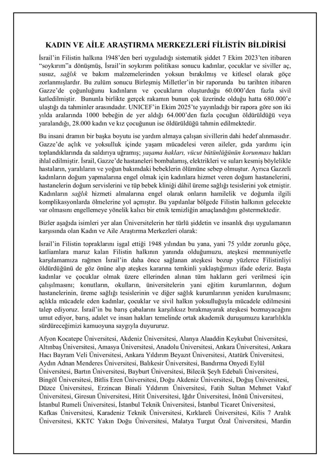Üniversitemizin de aralarında yer aldığı 48 Üniversitenin katılımıyla Kadın ve Aile Araştırma Merkezleri ve Kadın Platformları olarak 11 Ekim Dünya Kız Çocukları Günü'nde Filistin bildirisi yayınlandı.