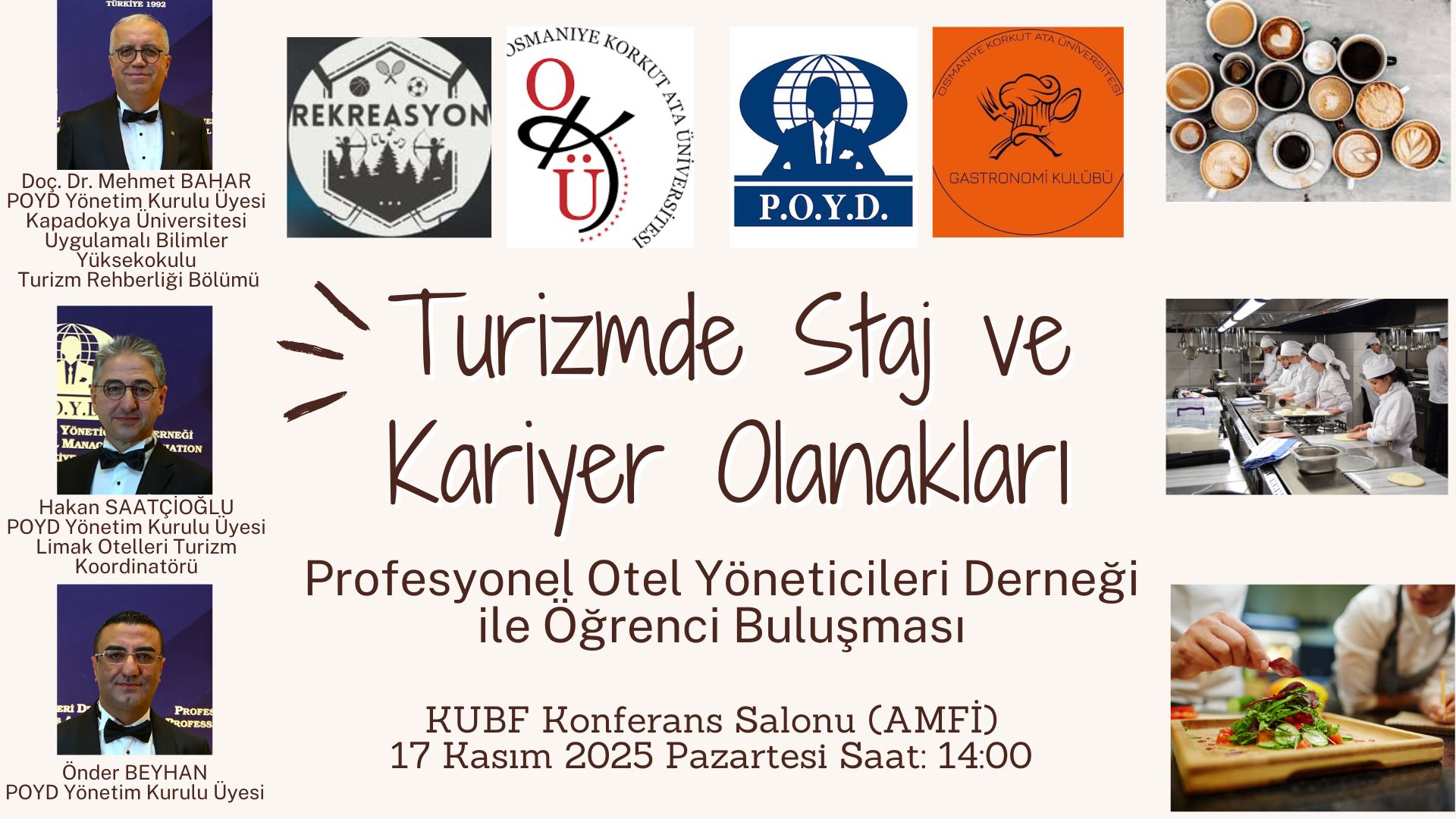 Osmaniye Korkut Ata Üniversitesi Kadirli Uygulamalı Bilimler Fakültesi tarafından, Profesyonel Otel Yöneticileri Derneği iş birliğiyle “Turizmde Staj ve Kariyer Olanakları” konulu öğrenci buluşması düzenlenecektir.
