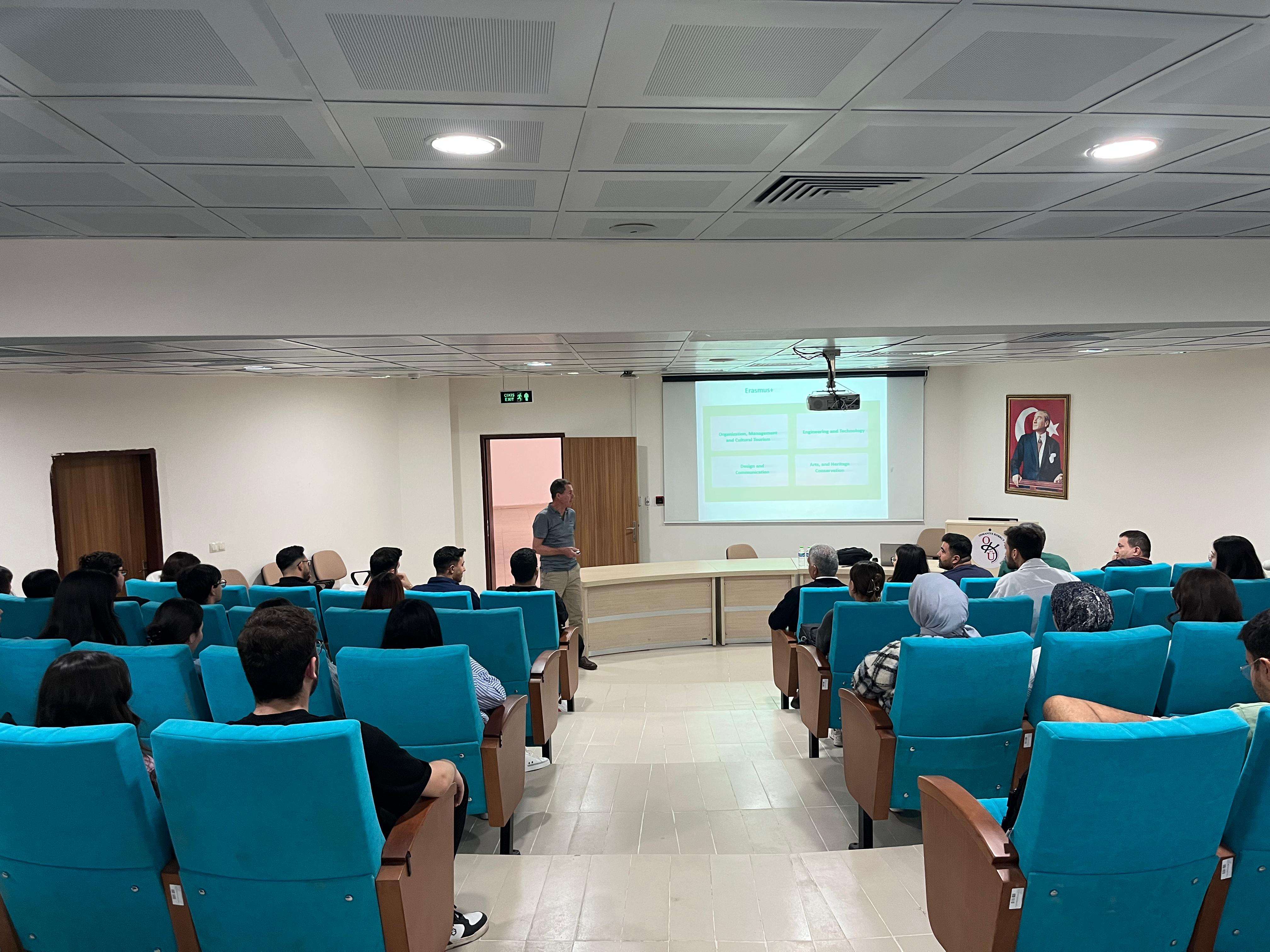 Erasmus değişim programı kapsamında üniversitemizi ziyaret eden Politécnico de Tomar (Portekiz) öğretim üyesi Prof. Dr. Valentim Nunes, Endüstri Mühendisliği Bölümü tarafından düzenlenen toplantıda akademik personel ve öğrencilerimizle bir araya geldi. Toplantı, MDBF Konferans Salonu’nda 4 Kasım 2025 günü saat 13:00’te gerçekleştirildi. Prof. Dr. Nunes, Portekiz’deki yükseköğretim sistemi, Erasmus iş birliği fırsatları ve Politécnico de Tomar’da yürütülen projeler hakkında bilgi paylaşımında bulundu. Ayrıca, iki kurum arasındaki olası akademik iş birlikleri üzerine fikir alışverişinde bulunuldu.