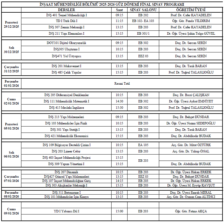 İnşaat Mühendisliği Bölümü 2025-2026 Güz Yarıyılı Lisans Final Sınav Programı