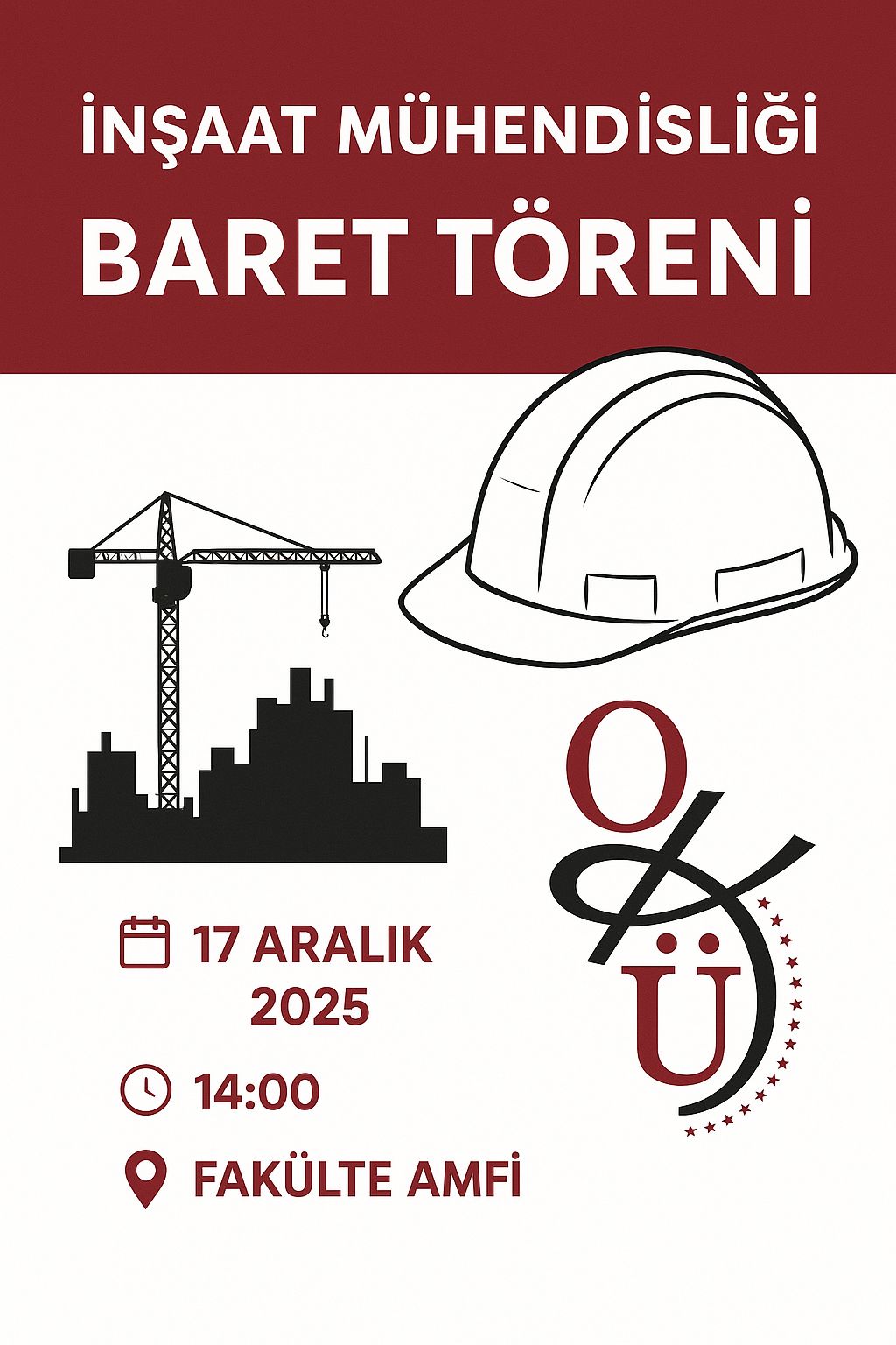 17 Aralık 2025 Çarşamba günü saat 14:00'da bölümümüzde bu sene kayıtlanan öğrencilerimiz için Fakültemiz Dekanlık Amfi Salonunda Baret Töreni yapılacaktır. Tüm öğrencilerimiz ve ilgi duyan herkesi aramızda görmekten mutluluk duyarız.