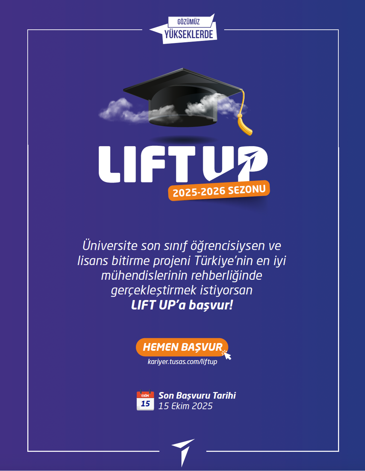 LIFT UP Sanayi Odaklı Lisans Bitirme Projeleri Programı, TUSAŞ'ın faaliyet alanları kapsamında, üniversitelerin lisans son sınıfında öğrenim gören öğrencilerin sanayi odaklı lisans bitirme projelerini TUSAŞ bünyesinde gerçekleştirmelerini sağlamaktadır. 2025-2026 dönemi LIFT UP Programı başvuruları, tarihine kadar adresinden kabul edilecektir.