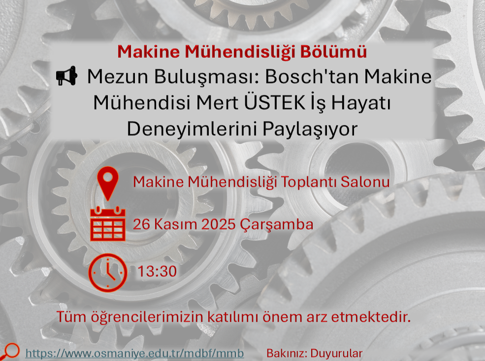 Makine Mühendisliği Bölümü öğrencileri için, mezunlarımızdan değerli bir konuğumuzun katılımıyla kariyer ve mesleki gelişim üzerine bilgilendirici bir etkinlik düzenlenecektir.
