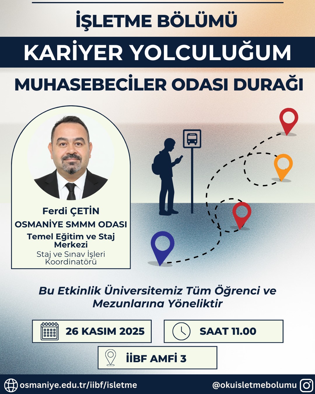 OKÜ İşletme Bölümü tarafından düzenlenen “Kariyer Yolculuğum: Muhasebeciler Odası Durağı” başlıklı söyleşi etkinliği, 26 Kasım 2025 tarihinde, Osmaniye Serbest Muhasebeci Mali Müşavirler Odası TESMER – Staj ve Sınav İşleri Koordinatörü Sayın Ferdi Çetin’in katılımıyla gerçekleştirilecektir.