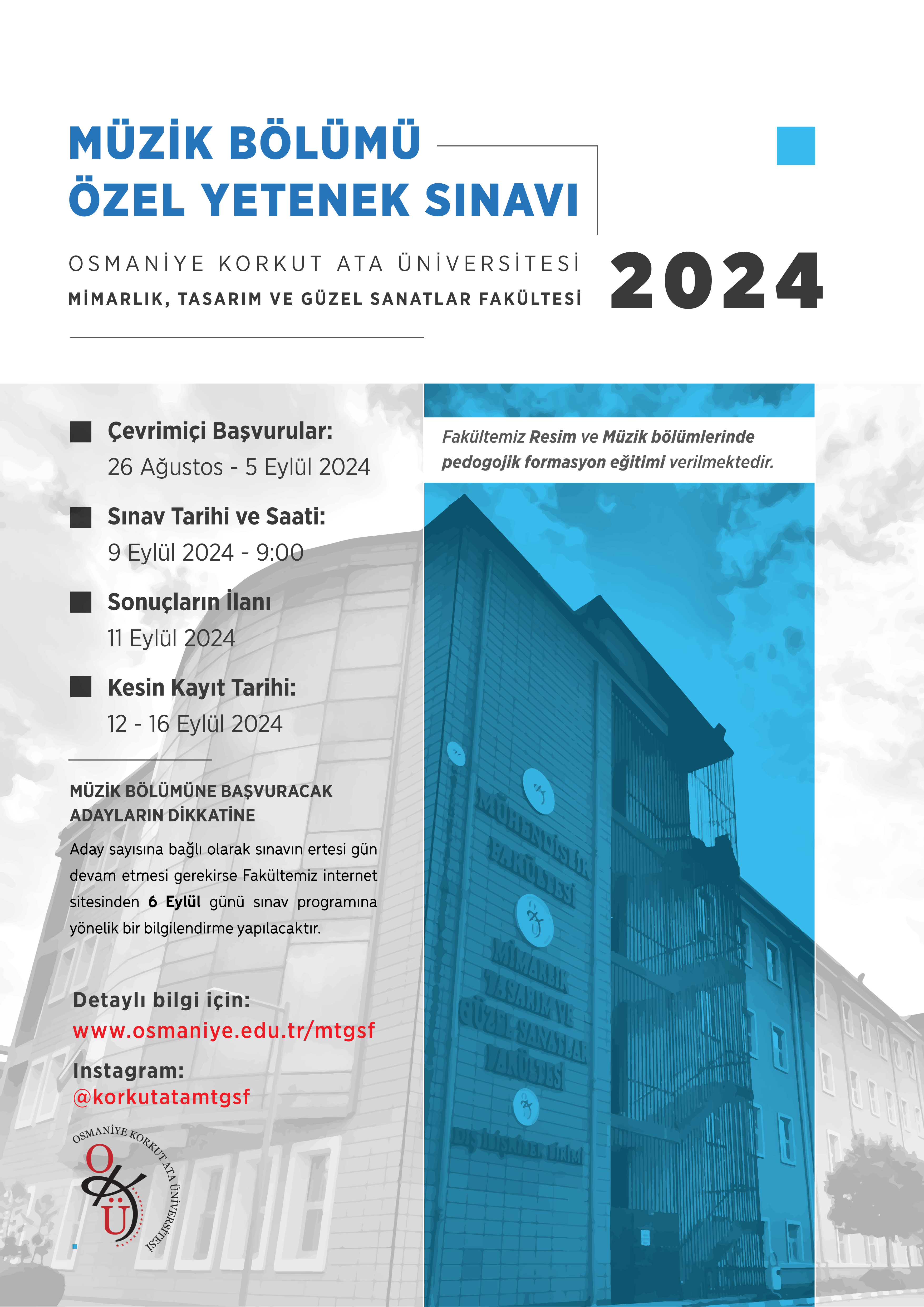 Müzik Bölümü Özel Yetenek Sınavı 9 Eylül 2024 tarihinde saat 09.00’da yapılacak olup, baÅŸvuran aday sayısına baÄŸlı olarak sınavın ertesi gün devam etmesi durumunda 06 Eylül 2024 günü Müzik Bölümü sınav programına yönelik bir bilgilendirme yapılacaktır. BaÅŸvurular 26 AÄŸustos-05 Eylül 2024 tarihleri arasında https://basvuru.osmaniye.edu.tr/ adresi üzerinden çevrimiçi olarak gerçekleÅŸtirilecektir.