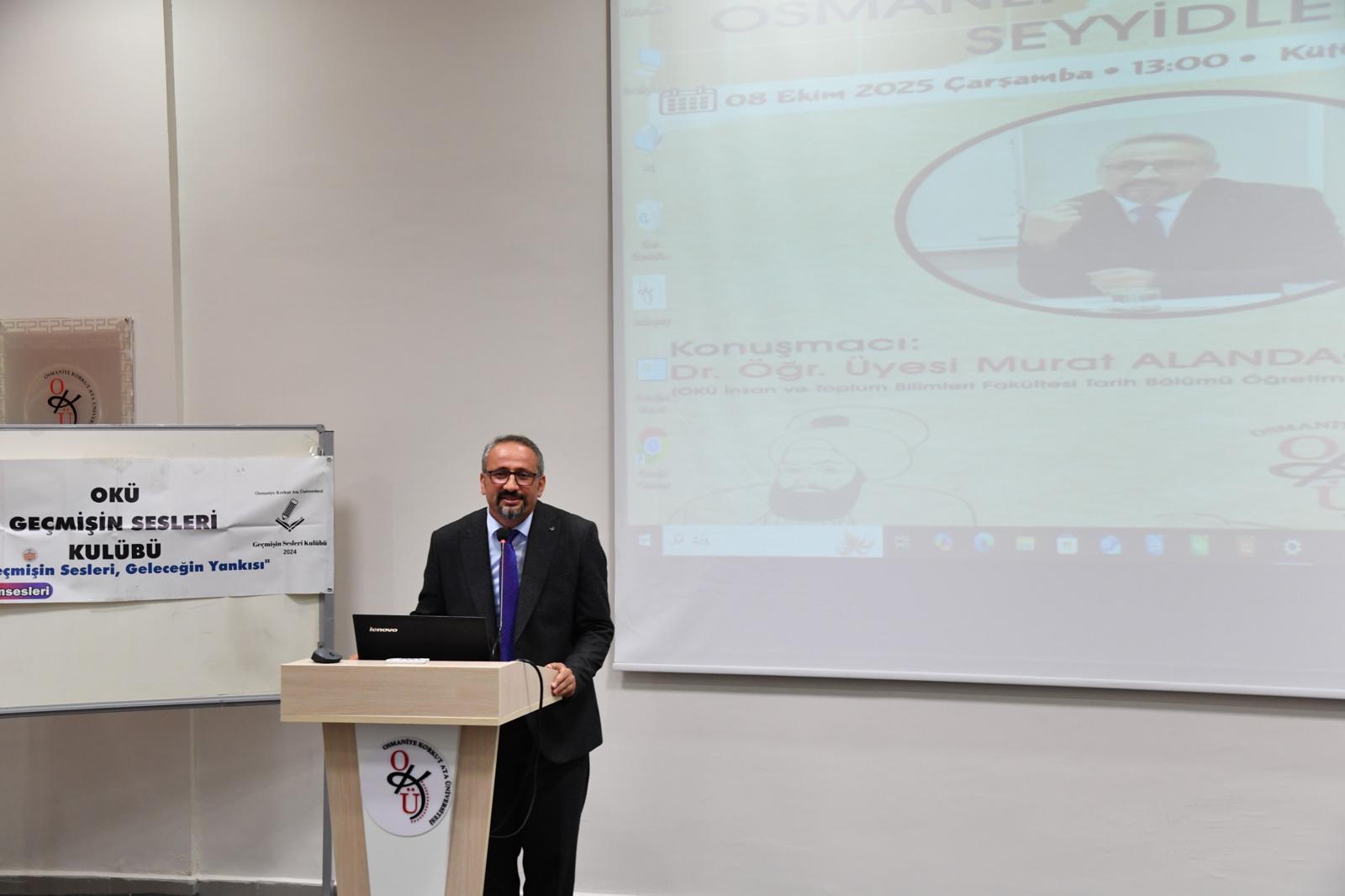 Kütüphane Amfisi’nde gerçekleştirilen etkinliğin konuşmacısı, İnsan ve Toplum Bilimleri Fakültesi Tarih Bölümü öğretim üyesi Doç. Dr. Murat Alandağlı oldu. Alandağlı, konuşmasında Osmanlı arşiv kayıtları üzerinden seyyidlik kurumunun toplumsal, kültürel ve idarî yönlerini ele alarak dönemin tarihî belgelerinden örnekler paylaştı.