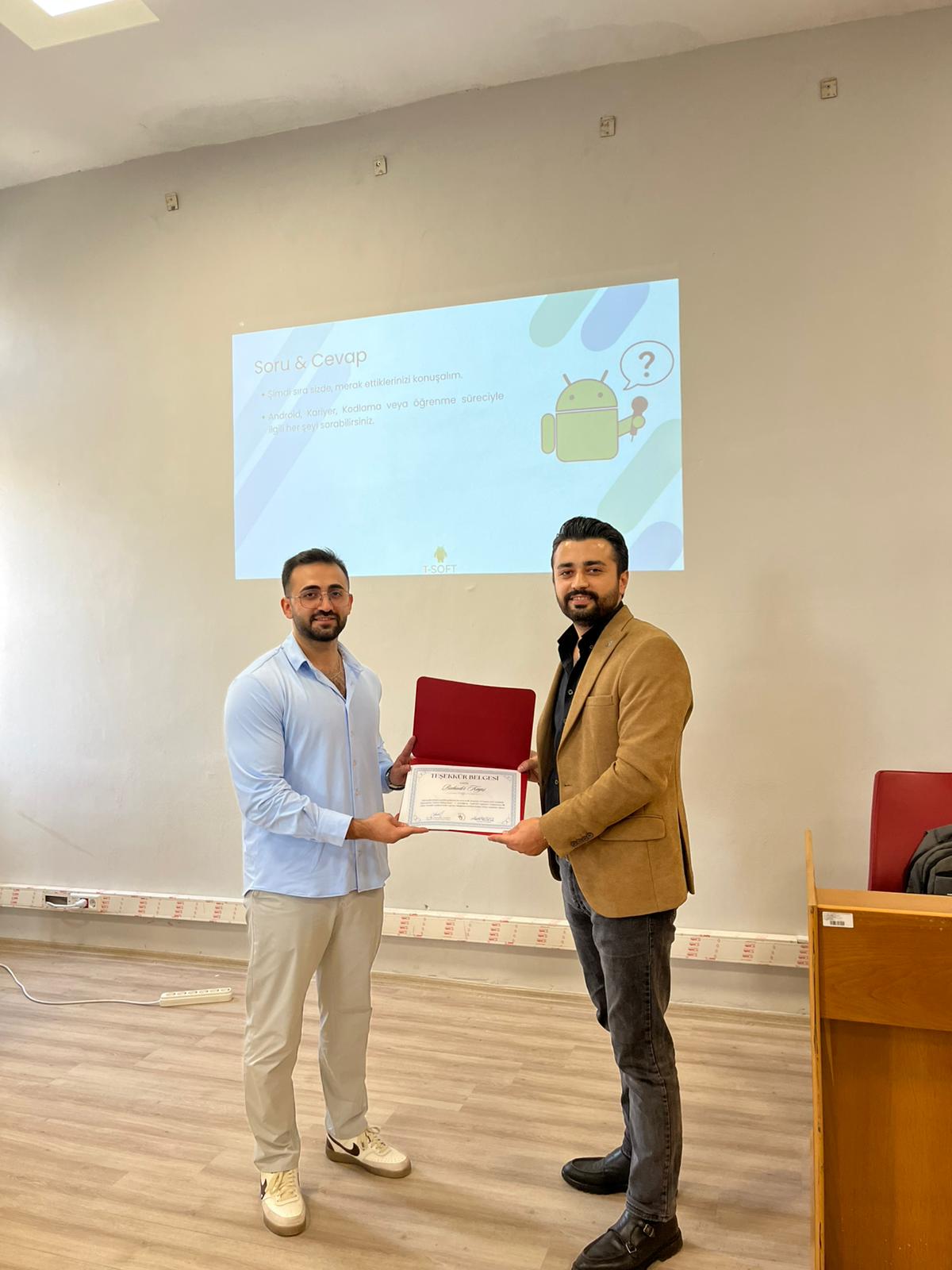 Programın sonunda, Bilgisayar Teknolojileri Bölümü Başkanı Dr. Öğr. Üyesi Emre Yıldırım tarafından konuşmacı Bahadır Kayış’a teşekkür belgesi takdim edildi.