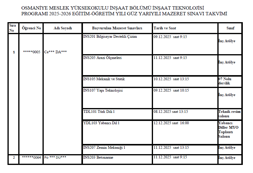 2025-2026 Güz Yarıyılı Vize Mazeret Sınav Programı