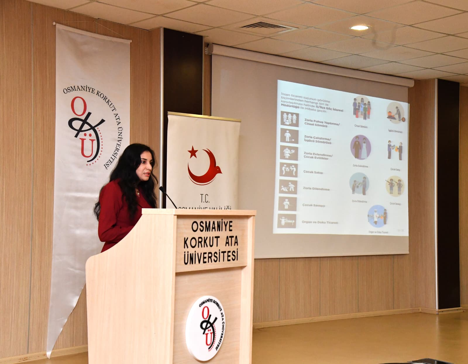 Rektörlük Büyük Salon’da gerçekleştirilen eğitimi, Osmaniye Valiliği İl Göç Müdürlüğü eğitmenlerinden Göç Uzman Yardımcısı Döndü Gizem Alıcı verdi. Eğitim süresince insan ticaretiyle mücadelede etkin yöntemler, ulusal ve uluslararası mevzuat çerçevesinde uygulanması gereken süreçler ile kamu kurumlarının sorumlulukları ele alındı.