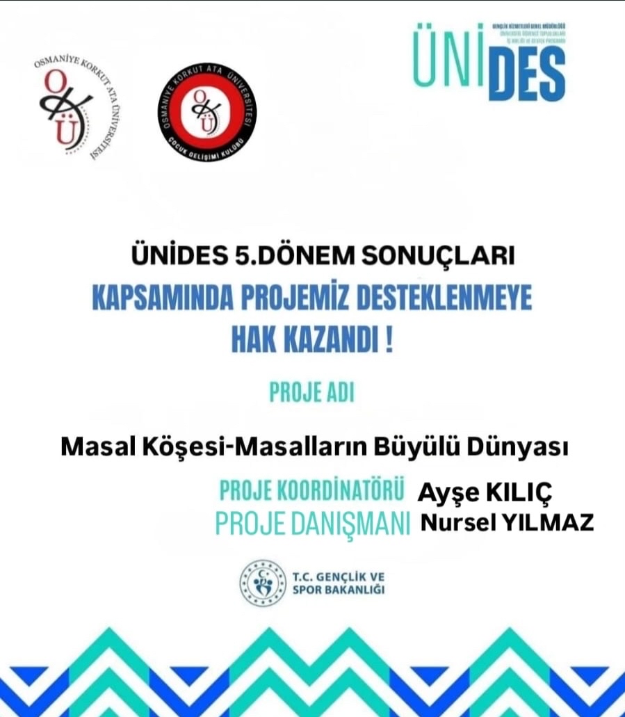 Yükseköğretim Kurulu Başkanlığı tarafından yürütülen ÜNİDES programı, öğrenci topluluklarının sosyal sorumluluk, gönüllülük, sürdürülebilirlik ve inovasyon alanlarında geliştirdikleri projeleri desteklemeyi amaçlıyor. Bu programda, bölüm hocamız Dr. Öğr. Üyesi Nursel YILMAZ danışmanlığında yaptığımız Masal Köşesi - Masalların Büyülü Dünyası adlı proje ile bölüm kulübümüz desteklenmeye hak kazanmıştır. Katkısı olan Dr. Öğr. Üyesi Nursel YILMAZ'ı ve öğrencilerini tebrik ediyor proje çalışmalarında ekibe başarılar diliyoruz.