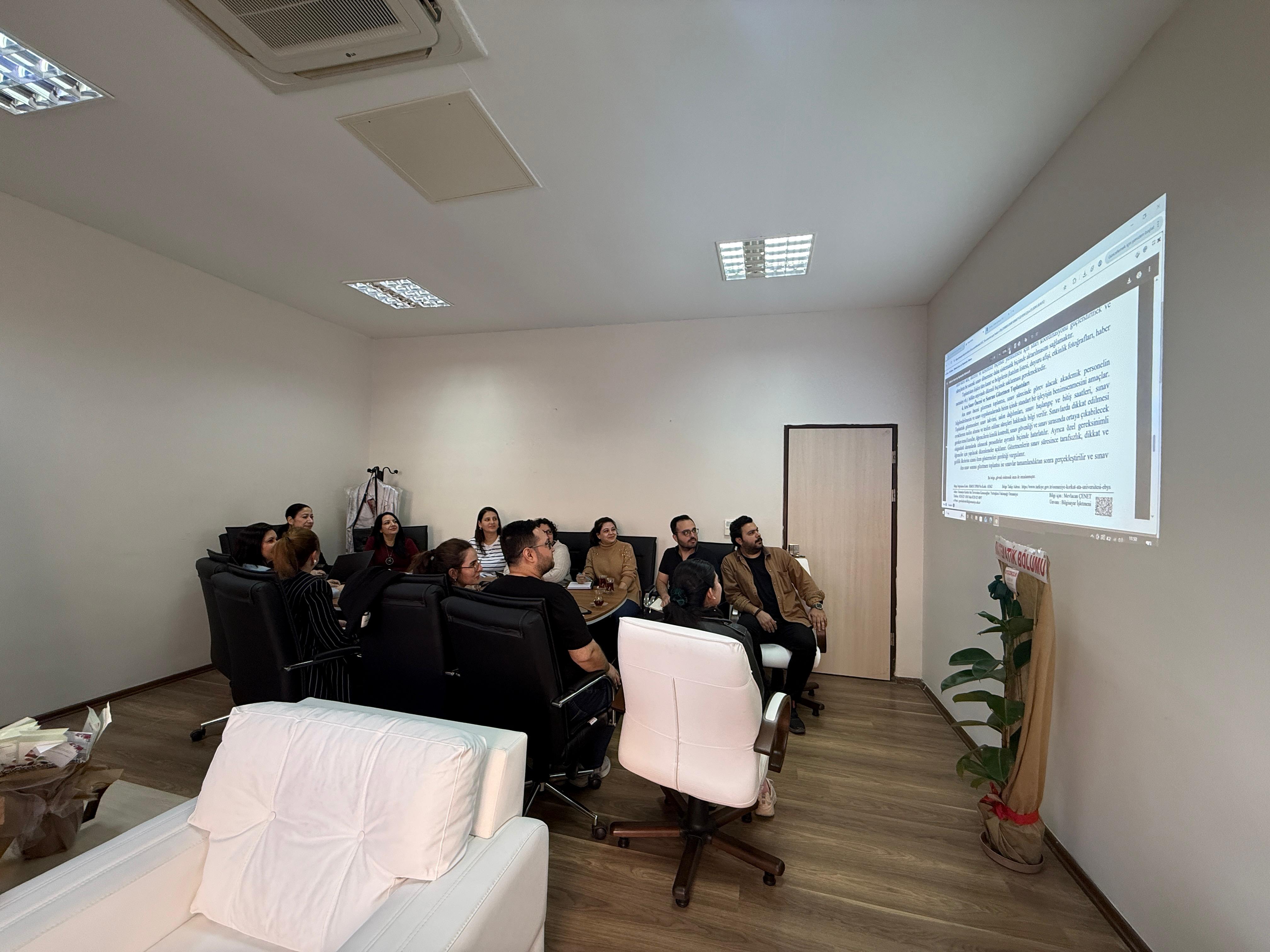 Toplantının amacı, sınav sürecinde görev alacak akademik personelin bilgilendirilmesi ve sınav uygulamalarında birim içinde standart bir işleyişin benimsenmesini sağlamak olarak belirtildi. Bu kapsamda, öğretim elemanlarına sınav takvimi, salon dağılımları, sınav başlangıç ve bitiş saatleri ile sınav evraklarının teslim alınma ve teslim edilme süreçleri hakkında ayrıntılı bilgiler verildi.