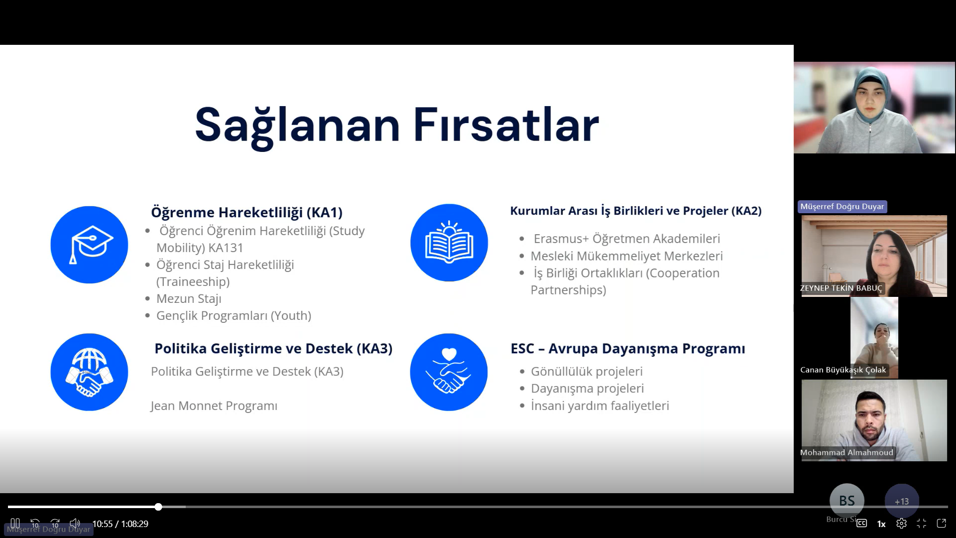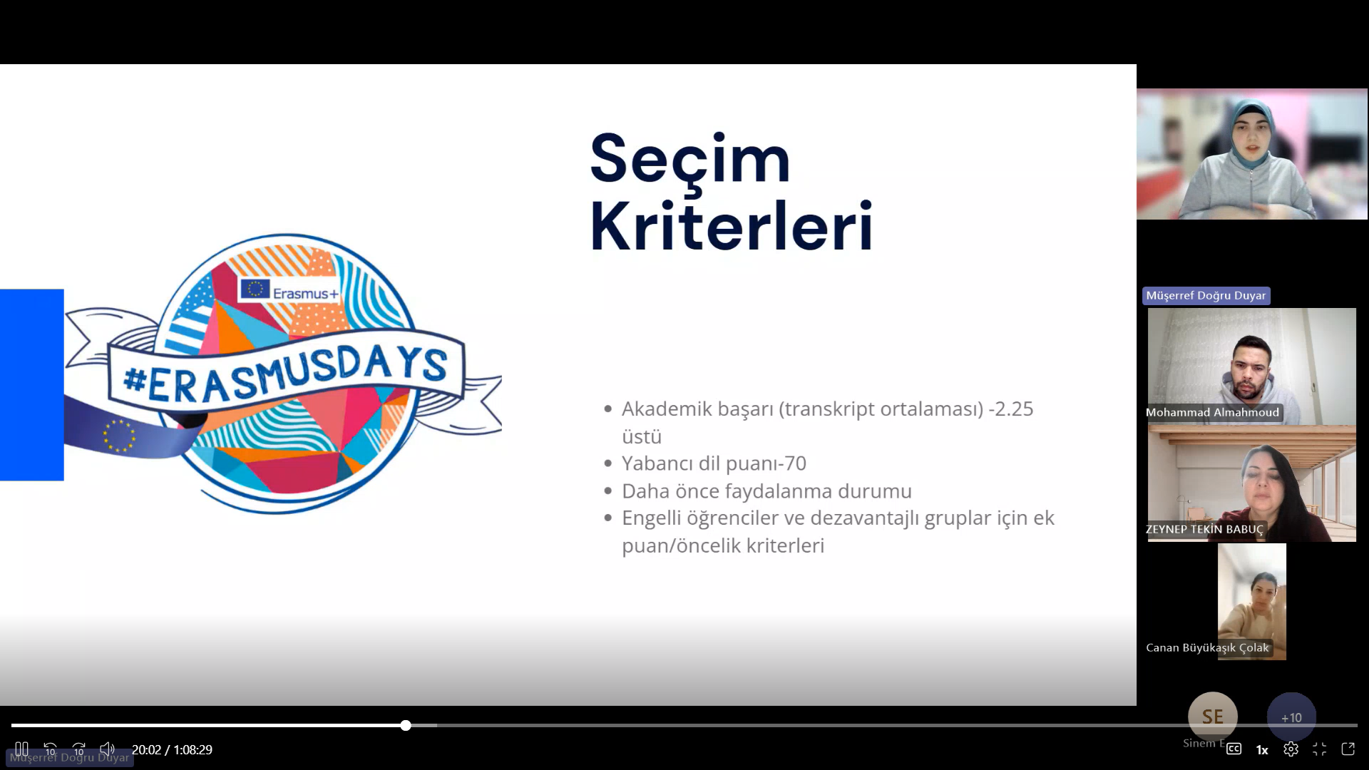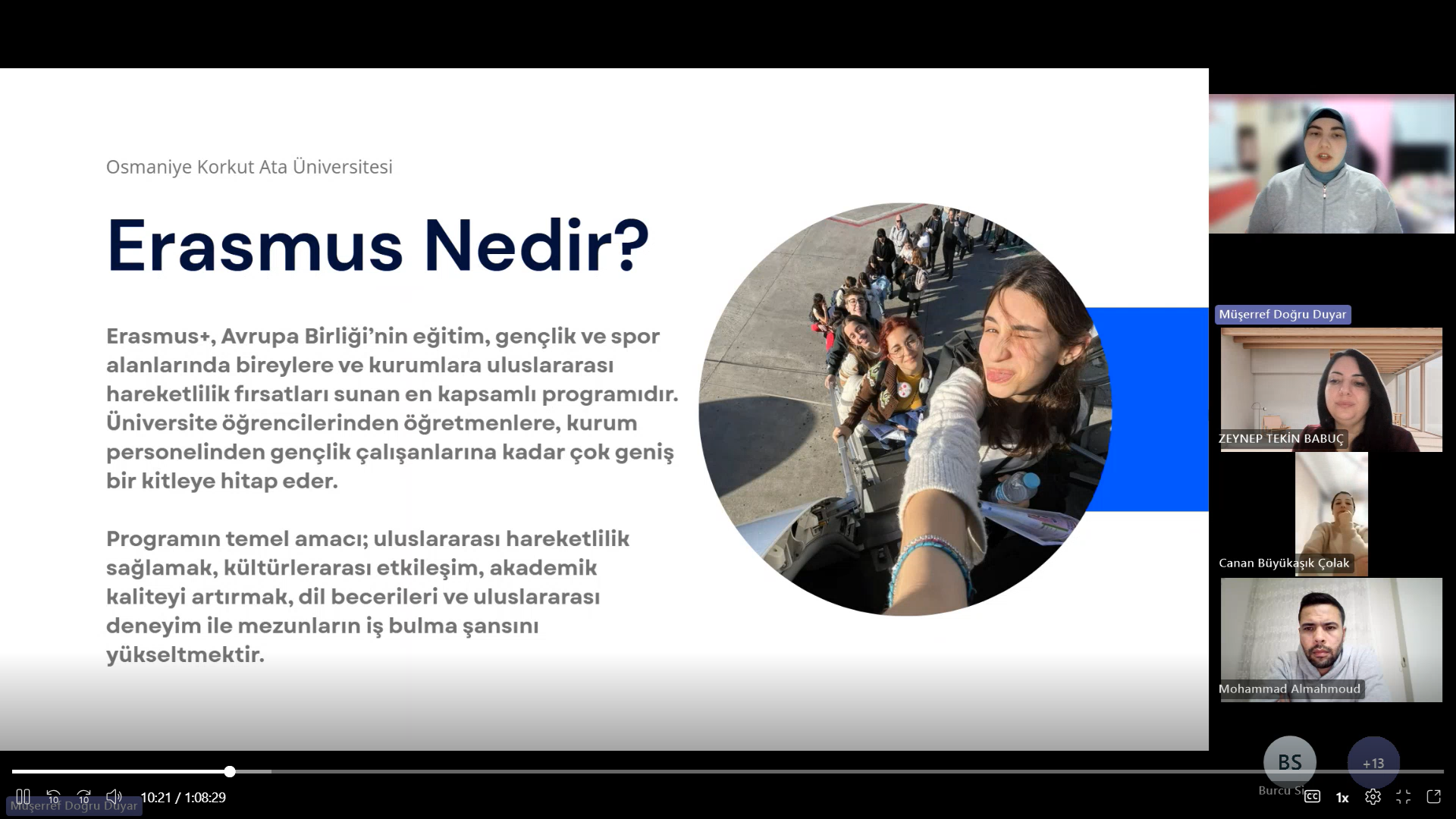 Toplantı, Bölüm Erasmus Koordinatörü Doç. Dr. Zeynep Tekin Babuç moderatörlüğünde, 2024–2025 dönemi mezunlarından Müşerref Doğru Duyar’ın konuşmacı olarak katılımıyla 27 Kasım 2025 Perşembe günü saat 19.00’da çevrim içi ortamda gerçekleştirilmiştir. Etkinliğe bölüm öğrencileri ve öğretim elemanları da katılım sağlamıştır. Toplantının gündeminde; Erasmus programına başvuru süreci, seçim kriterleri, gerekli belgeler, hibe desteği, yurt dışında öğrenim/staj deneyimleri ve uluslararası hareketlilikle ilgili pratik bilgiler yer almıştır. Ayrıca katılımcılar, sorularını yönelterek uygulamalar, yurtdışı deneyimi ve başvuru süreci hakkında birebir bilgilendirme alma fırsatı bulmuştur.