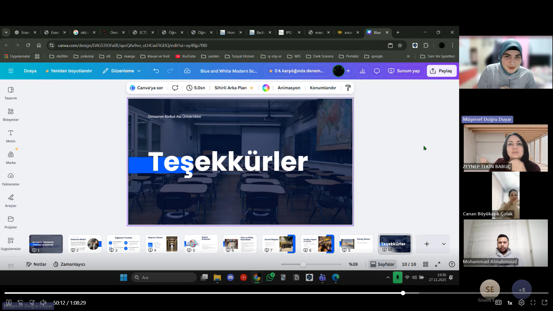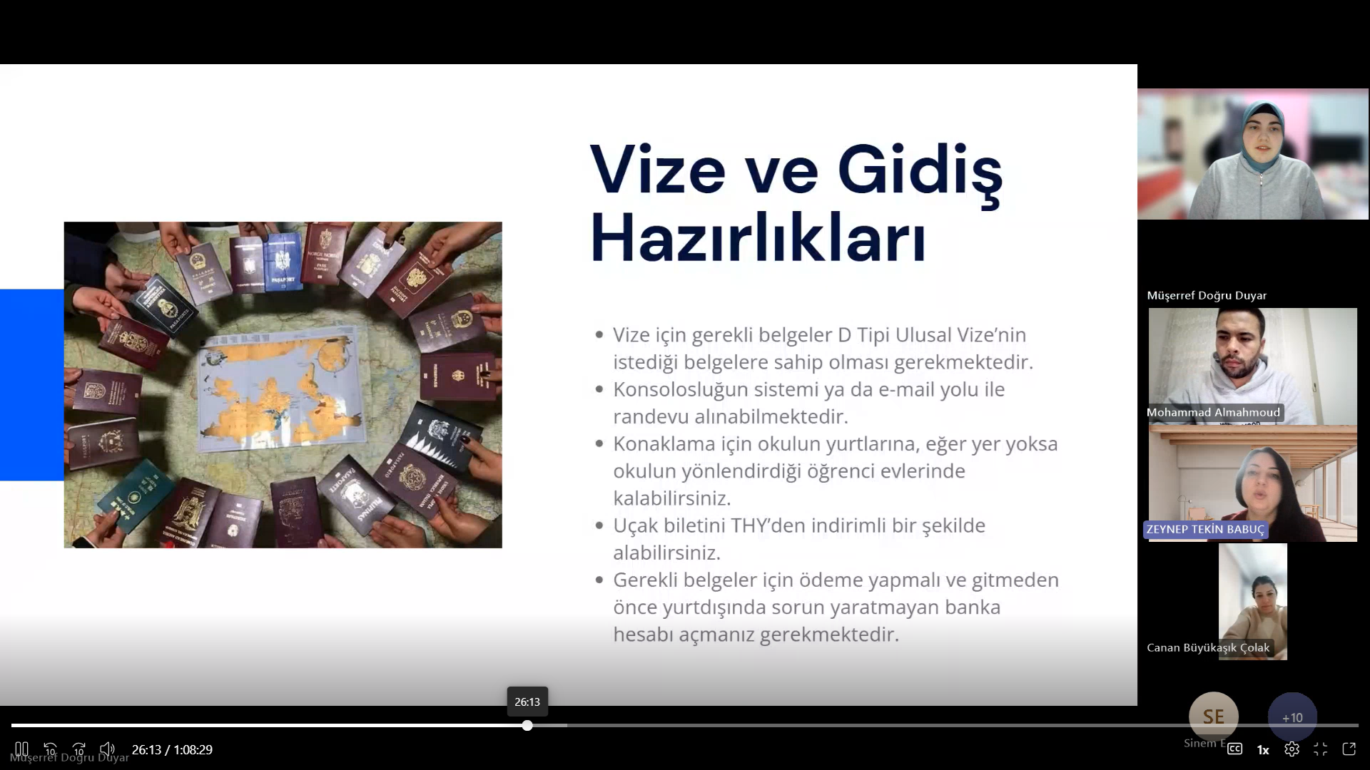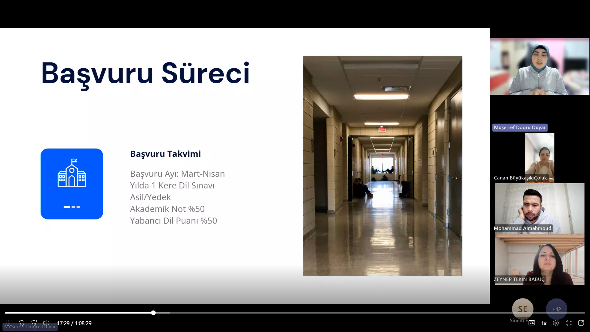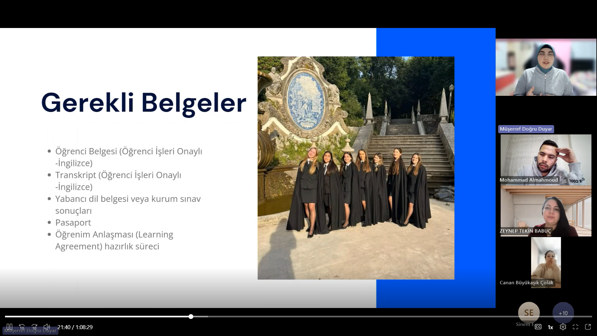 Toplantı, Bölüm Erasmus Koordinatörü Doç. Dr. Zeynep Tekin Babuç moderatörlüğünde, 2024–2025 dönemi mezunlarından Müşerref Doğru Duyar’ın konuşmacı olarak katılımıyla 27 Kasım 2025 Perşembe günü saat 19.00’da çevrim içi ortamda gerçekleştirilmiştir. Etkinliğe bölüm öğrencileri ve öğretim elemanları da katılım sağlamıştır. Toplantının gündeminde; Erasmus programına başvuru süreci, seçim kriterleri, gerekli belgeler, hibe desteği, yurt dışında öğrenim/staj deneyimleri ve uluslararası hareketlilikle ilgili pratik bilgiler yer almıştır. Ayrıca katılımcılar, sorularını yönelterek uygulamalar, yurtdışı deneyimi ve başvuru süreci hakkında birebir bilgilendirme alma fırsatı bulmuştur.